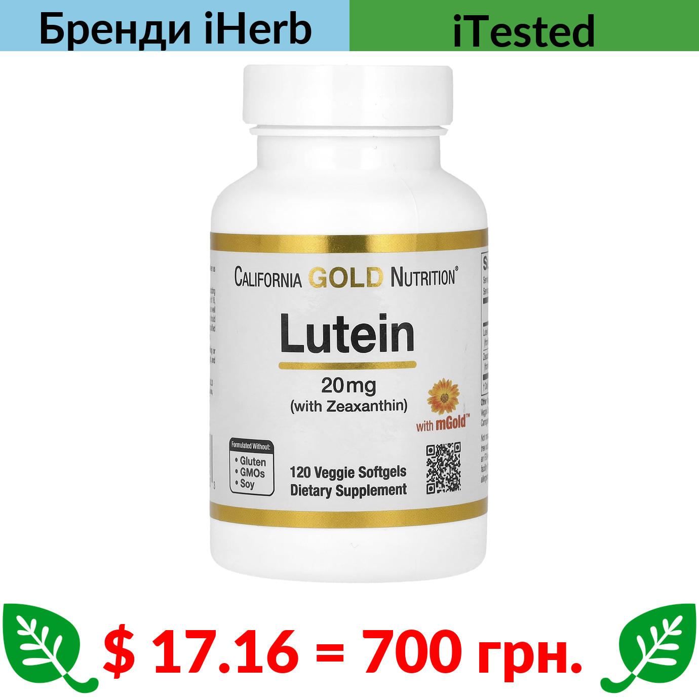 $ 17.16 = 700 грн. California Gold Nutrition, лютеїн із зеаксантином, 20 мг, 120 вегетаріанських капсул