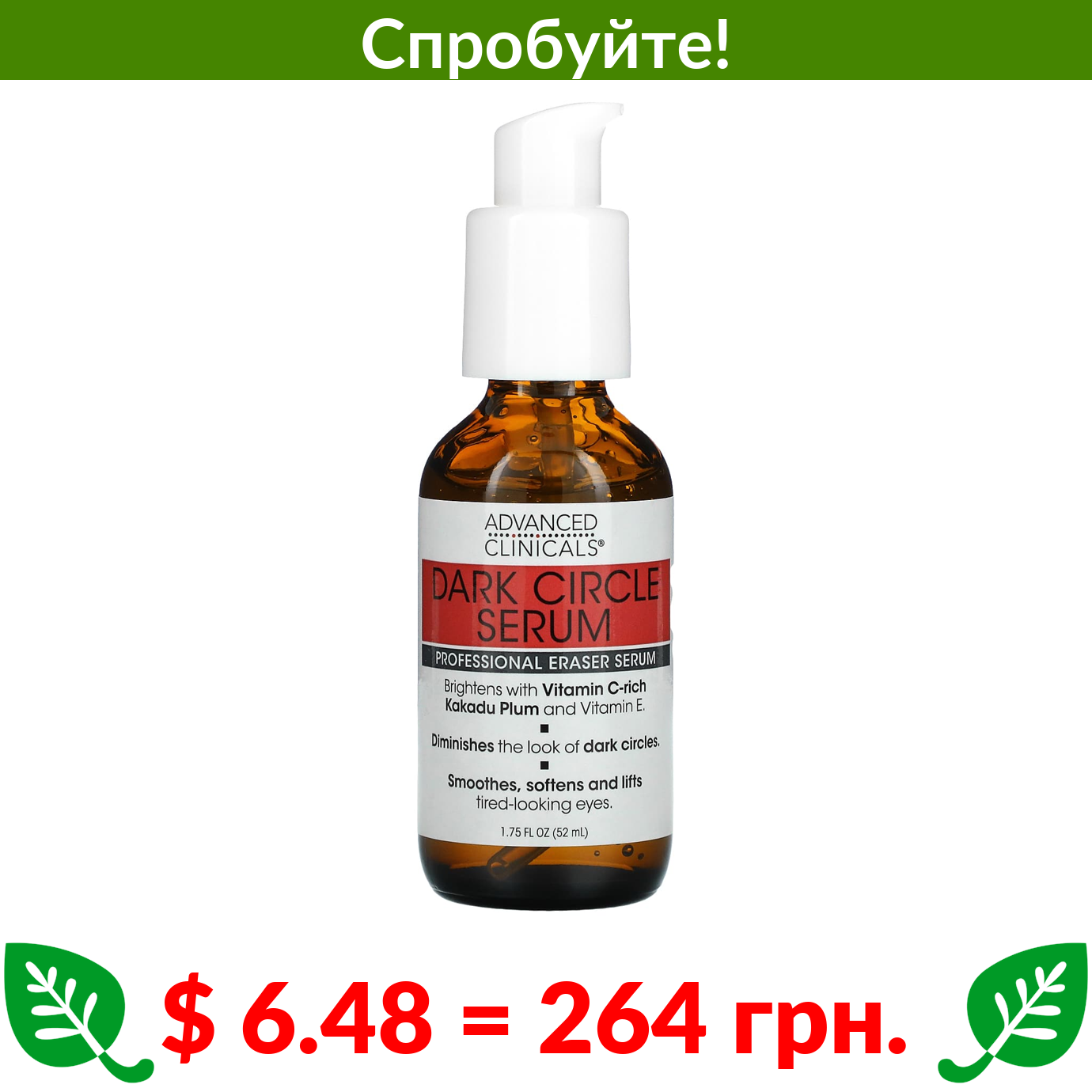 $ 6.48 = 264 грн. ???? варто спробувати ???? Advanced Clinicals, сироватка проти темних кіл, без ароматизаторів, 52 мл (1,75 рідк. унції)