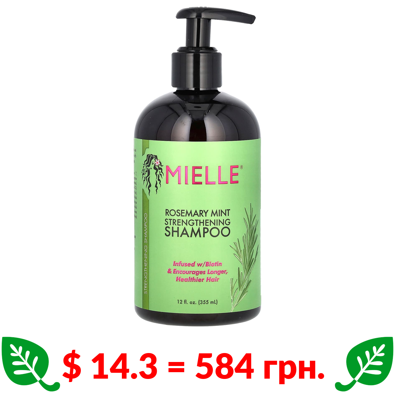 $ 14.3 = 584 грн. Mielle, Зміцнюючий шампунь, м’ята з розмарином, 12 рідких унцій (355 мл)