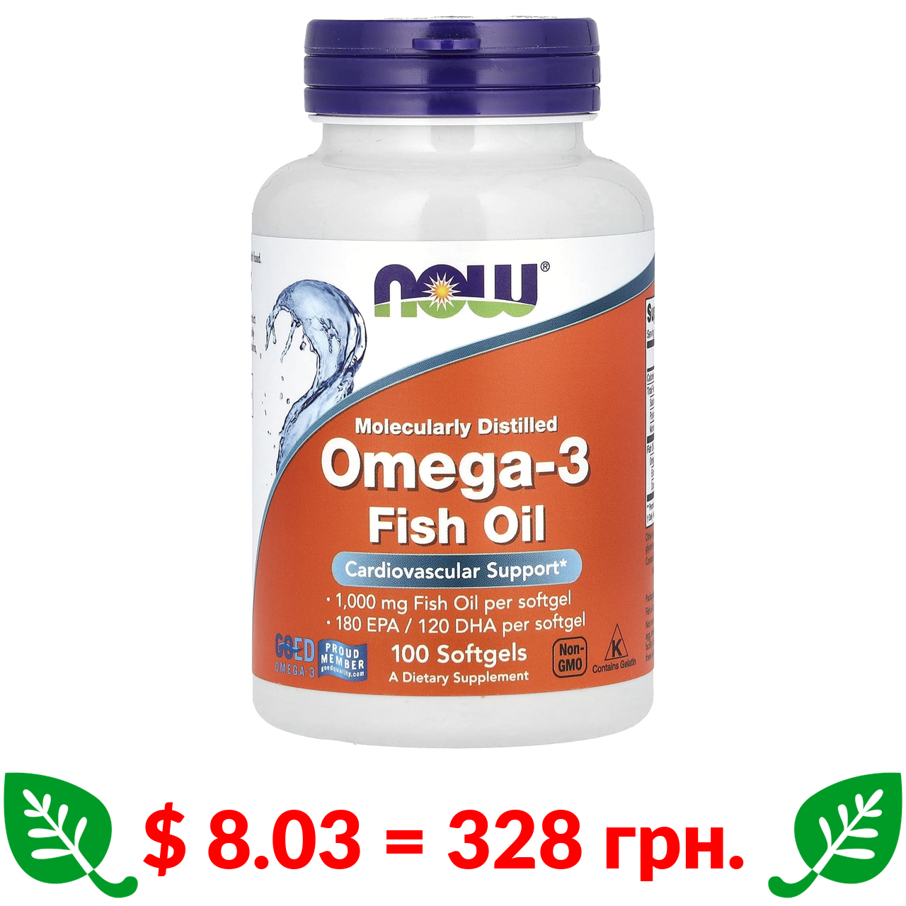 $ 8.03 = 328 грн. Now Foods, риб’ячий жир з омега-3, 2000 мг, 100 капсул (1000 мг в 1 капсулі)
