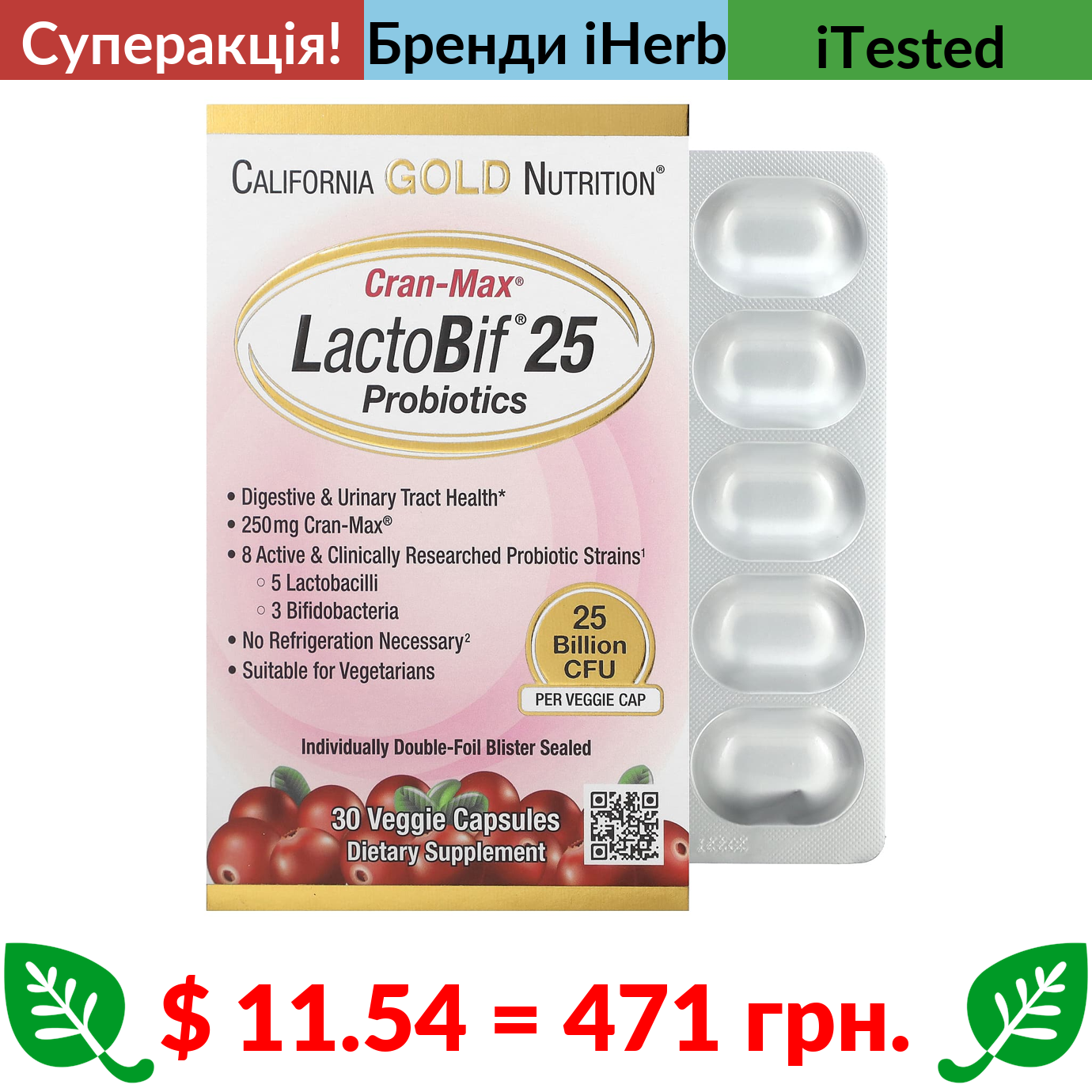 $ 11.54 = 471 грн. ???? cуперакція! ???? California Gold Nutrition, LactoBif, Cran-Max, пробіотики, 25 млрд КУО, 30 рослинних капсул