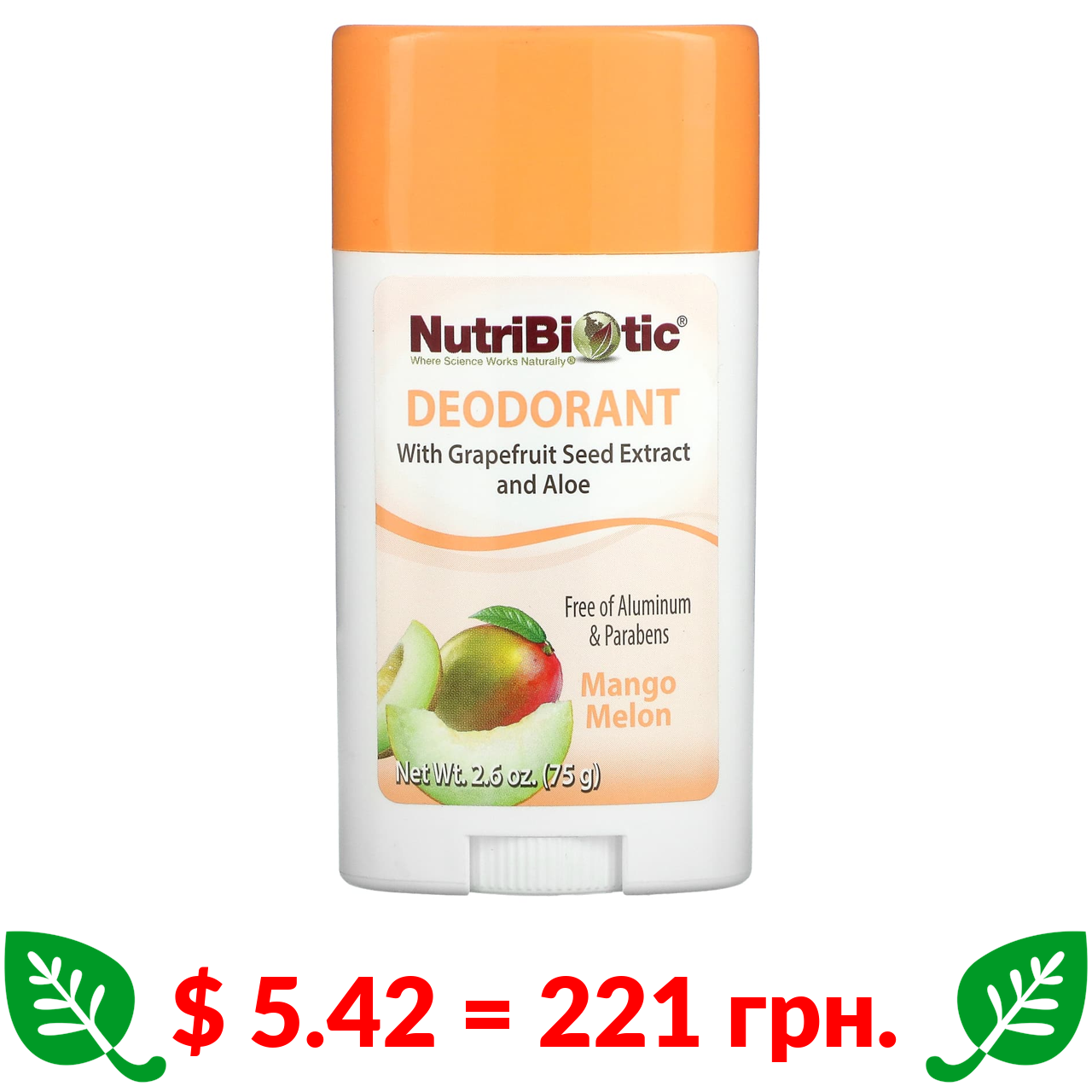 $ 5.42 = 221 грн. NutriBiotic, дезодорант, манго й диня, 75 г (2,6 унції)