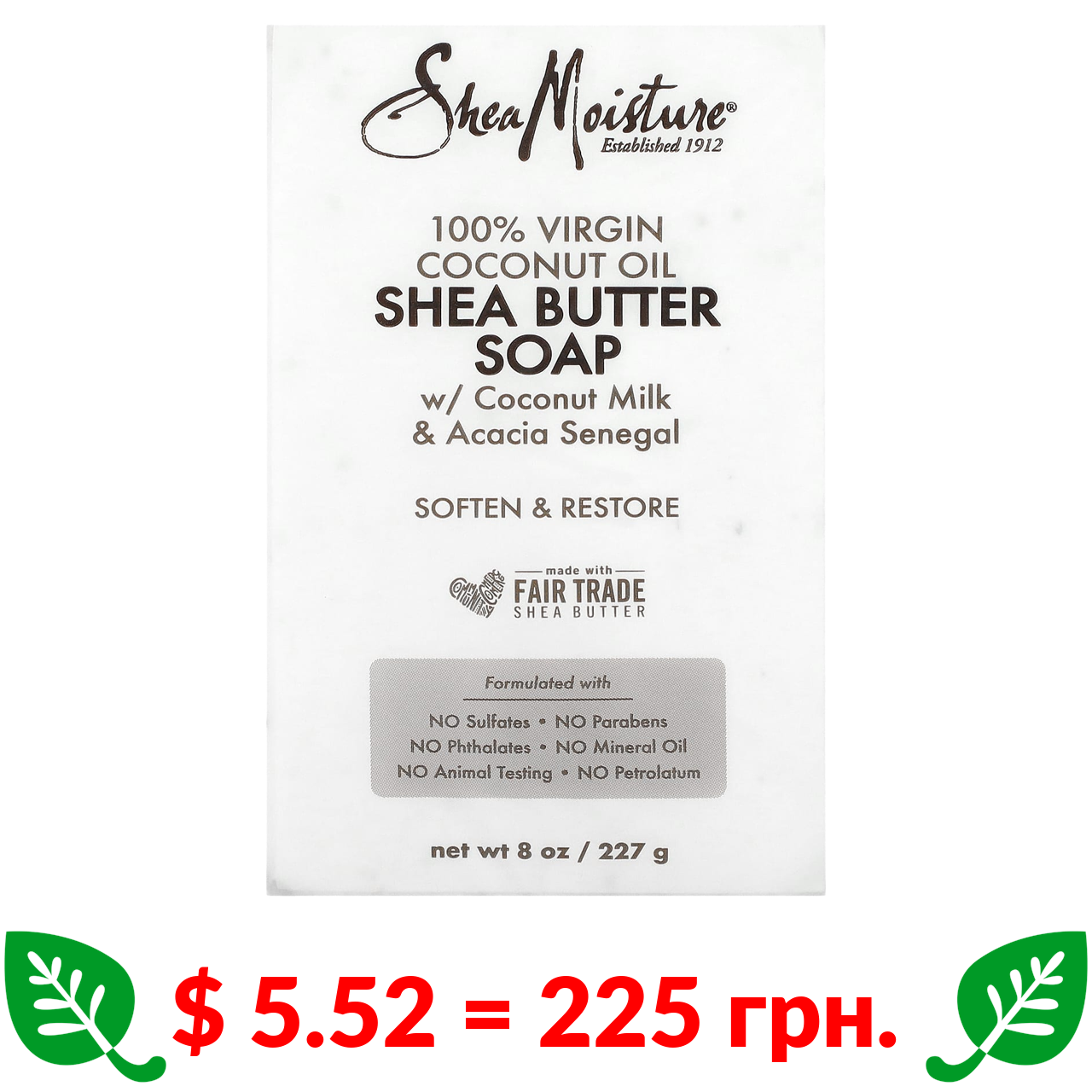 $ 5.52 = 225 грн. ????️ у кошику ????️ SheaMoisture, мило зі 100 % кокосовою олією першого віджиму та маслом ши, 227 г (8 унцій)