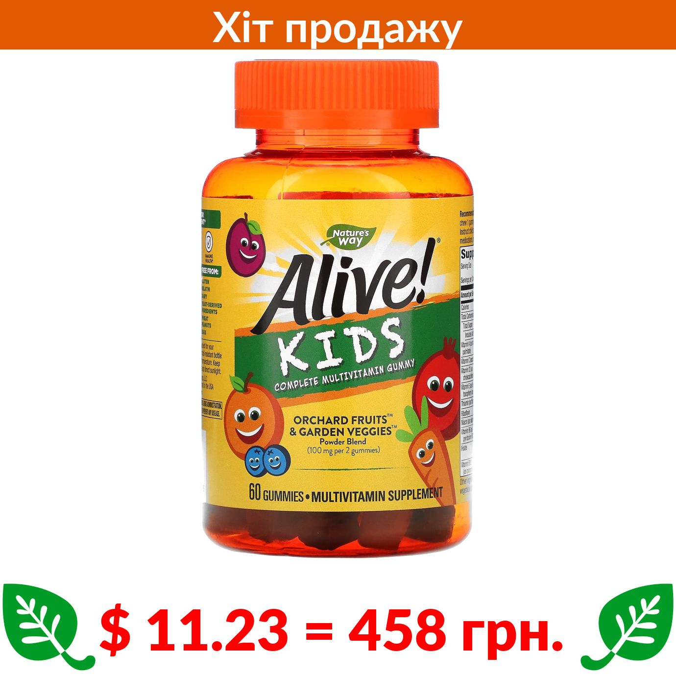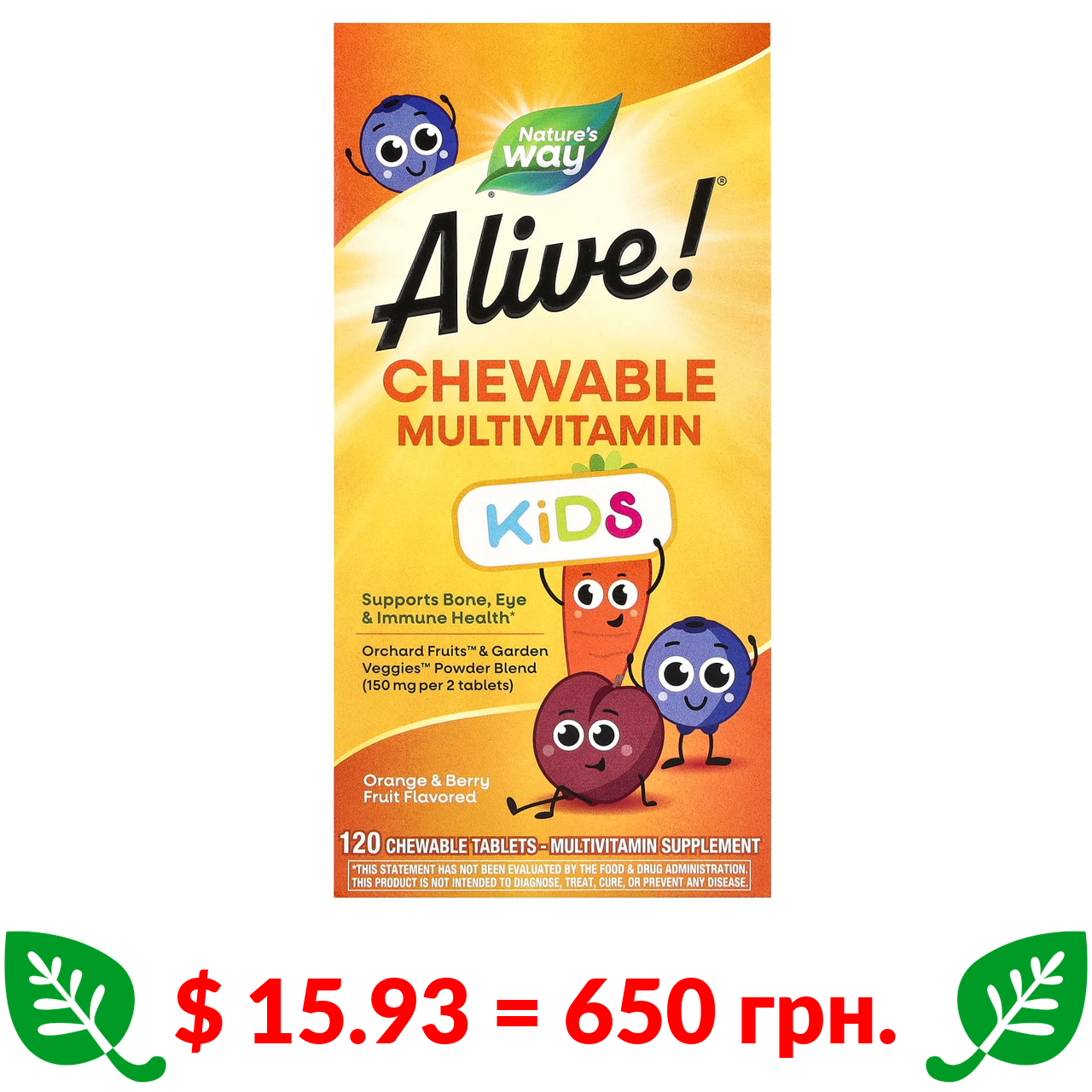 $ 15.93 = 650 грн. Nature’s Way, Alive! Kids, жувальні мультивітаміни для дітей, зі смаком апельсина та ягід, 120 жувальних таблеток