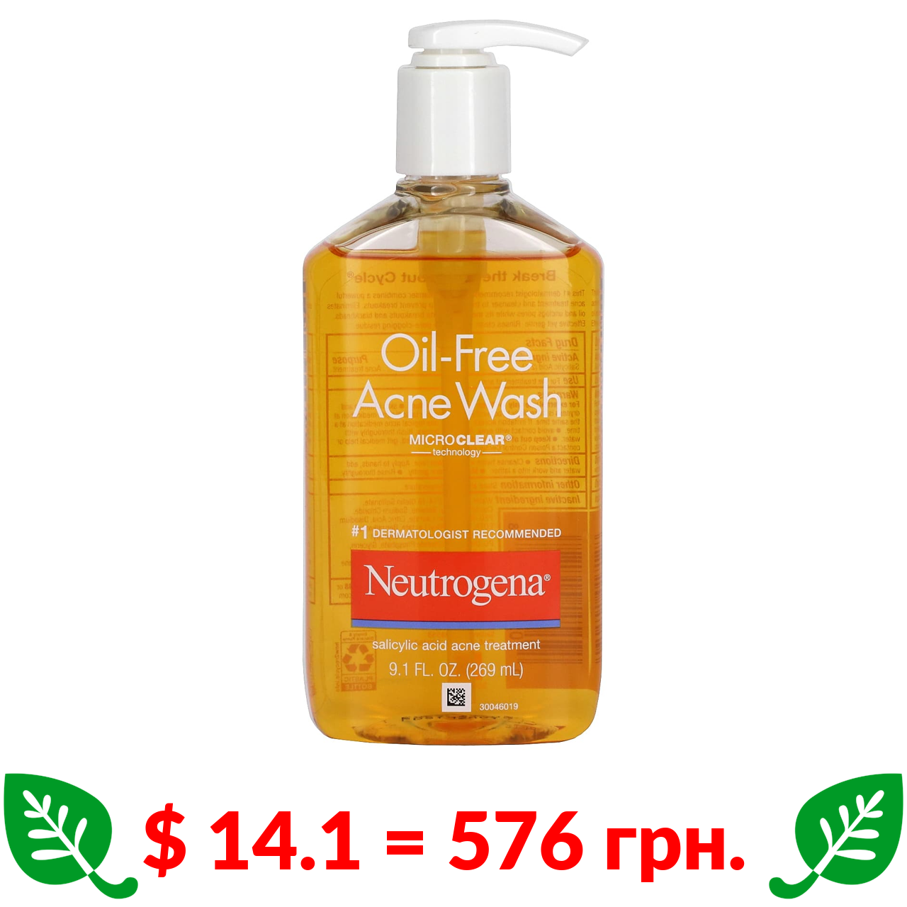 $ 14.1 = 576 грн. Neutrogena, гель для вмивання без олії від вугрової висипки, 269 мл (9,1 рідк. унції)