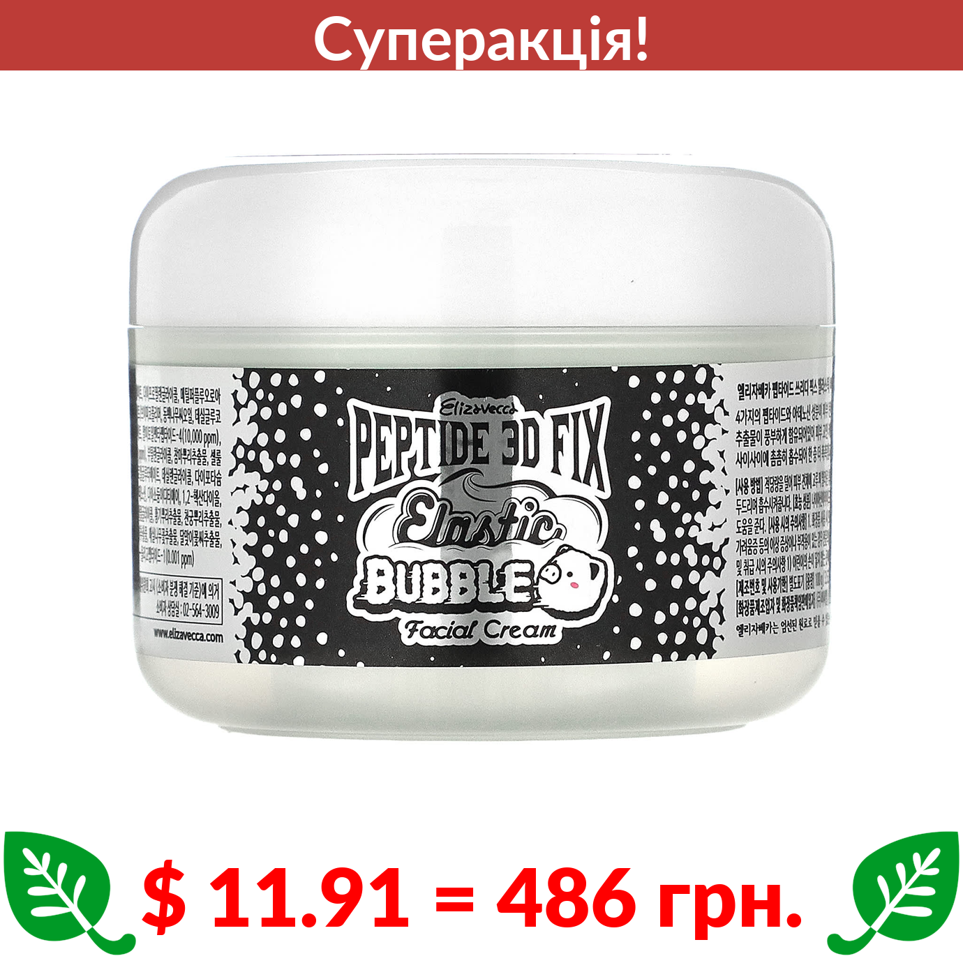 $ 11.91 = 486 грн. ???? cуперакція! ???? Elizavecca, Peptide 3D Fix Elastic Bubble, крем для обличчя, 100 г (3,53 унції)