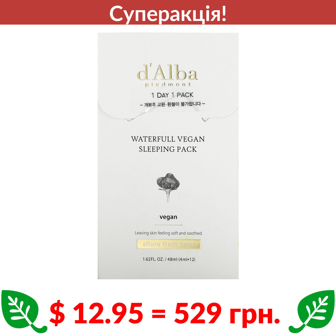 $ 12.95 = 529 грн. ???? cуперакція! ???? d’Alba, Waterfull Vegan Sleeping Pack, 12 пакетиків по 4 мл (0,13 рідк. унції)