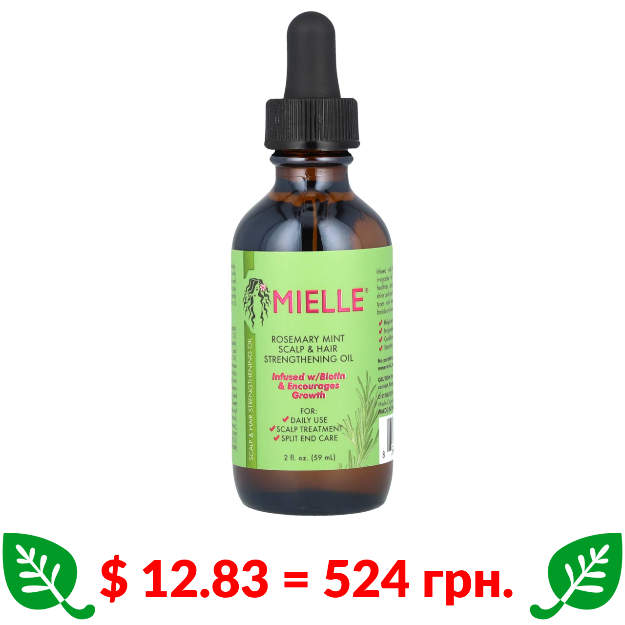 $ 12.83 = 524 грн. Mielle, олія для зміцнення волосся і шкіри голови, розмарин і м’ята, 59 мл (2 рідк. унції)