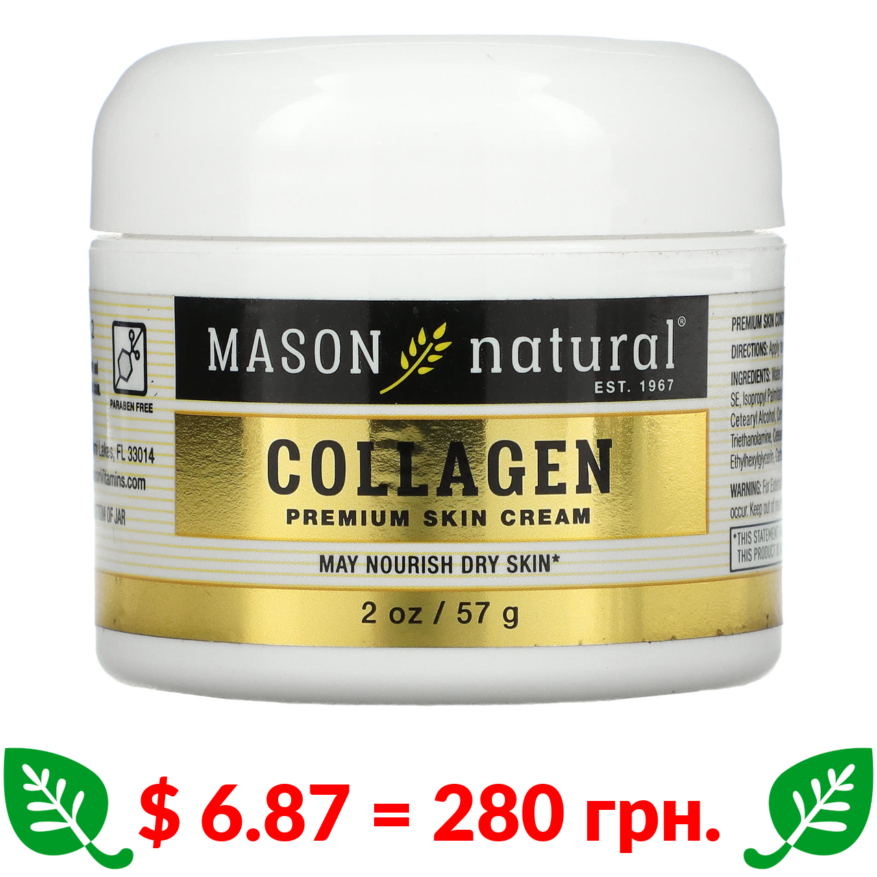 $ 6.87 = 280 грн. ????️ у кошику ????️ Mason Natural, крем для шкіри з колагеном преміальної якості, 57 г (2 унції)