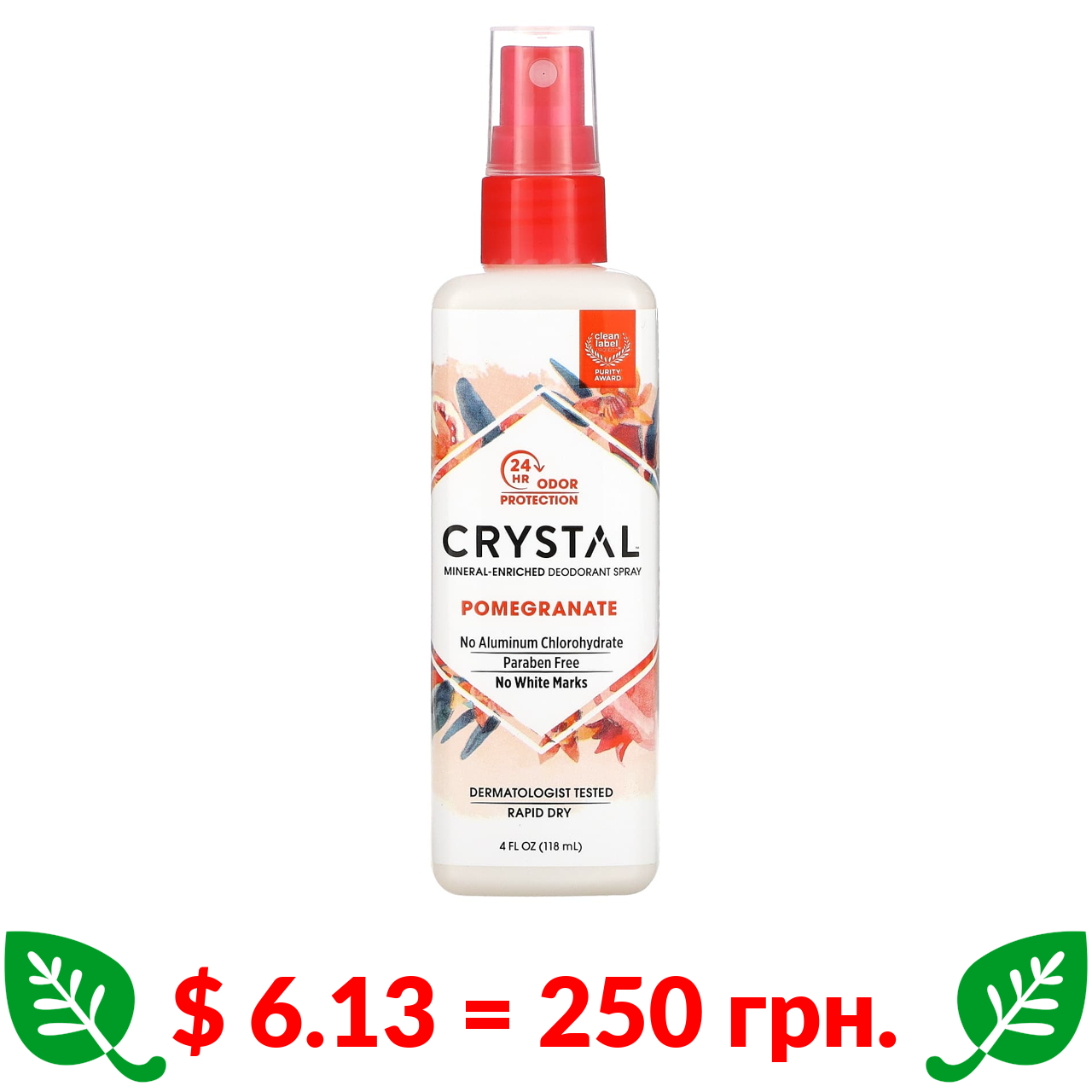 $ 6.13 = 250 грн. Crystal Body Deodorant, мінеральний спрей-дезодорант, гранат, 118 мл (4 рідк. унції)
