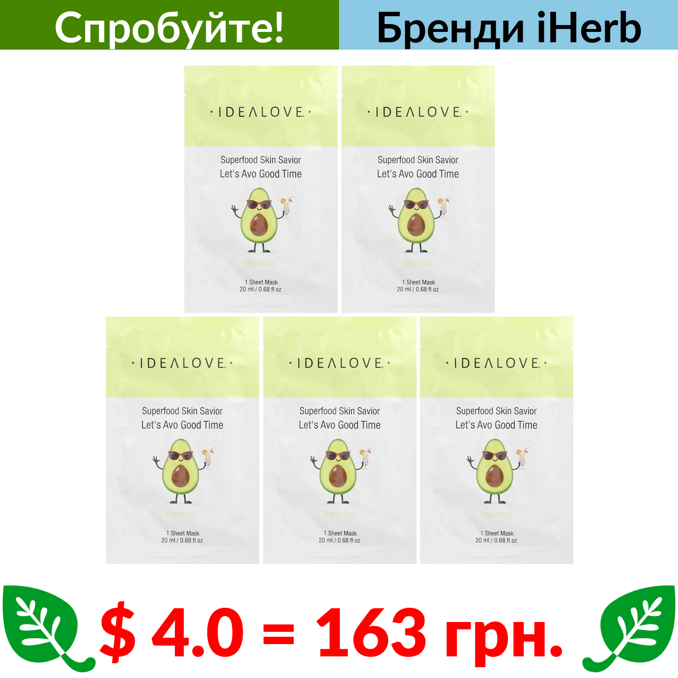 $ 4.0 = 163 грн. ???? варто спробувати ???? Idealove, Superfood Skin Savior, маска із суперфудами, авокадо, 5 шт. по 20 мл (0,68 рідк. унції)