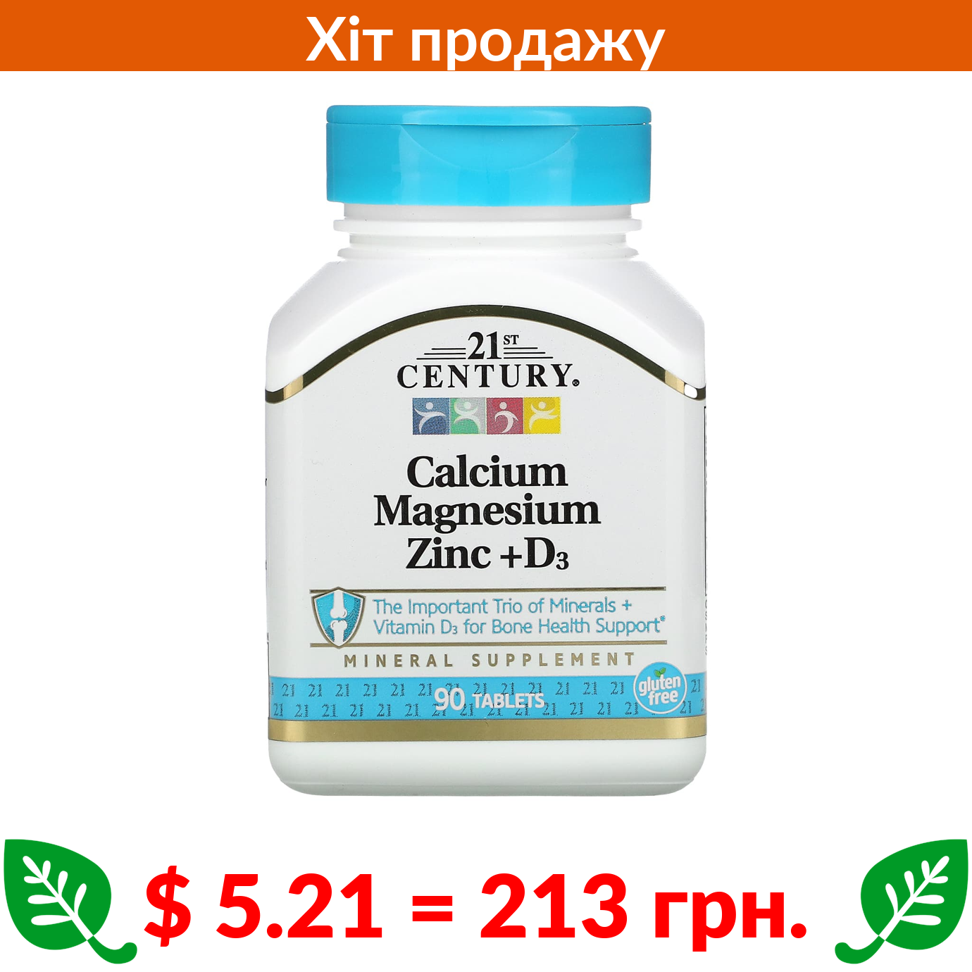 $ 5.21 = 213 грн. 21st Century, кальцій, магній, цинк і вітамін D3, 90 таблеток