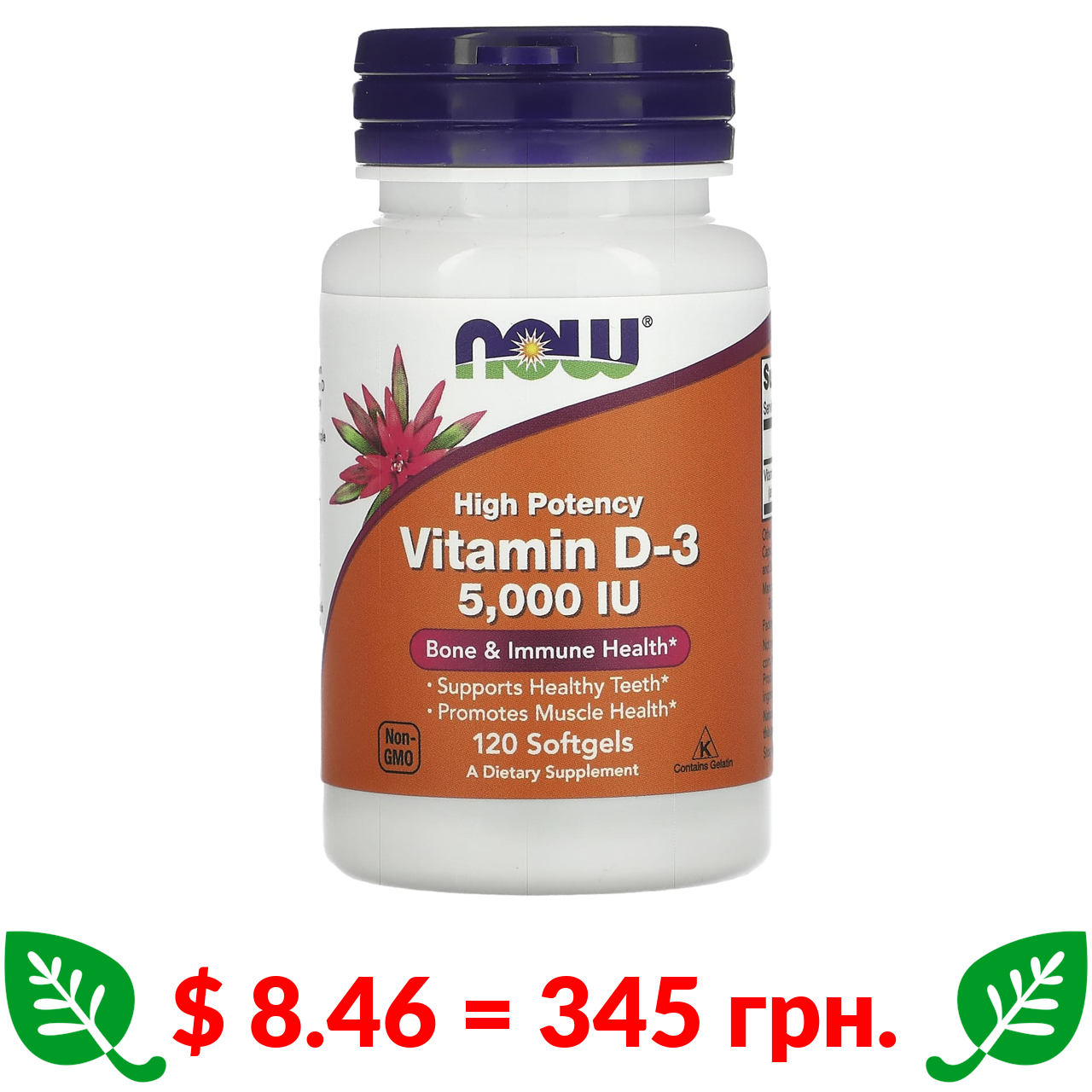 $ 8.46 = 345 грн. Now Foods, високоефективний вітамін D3, 5000 МО, 120 капсул