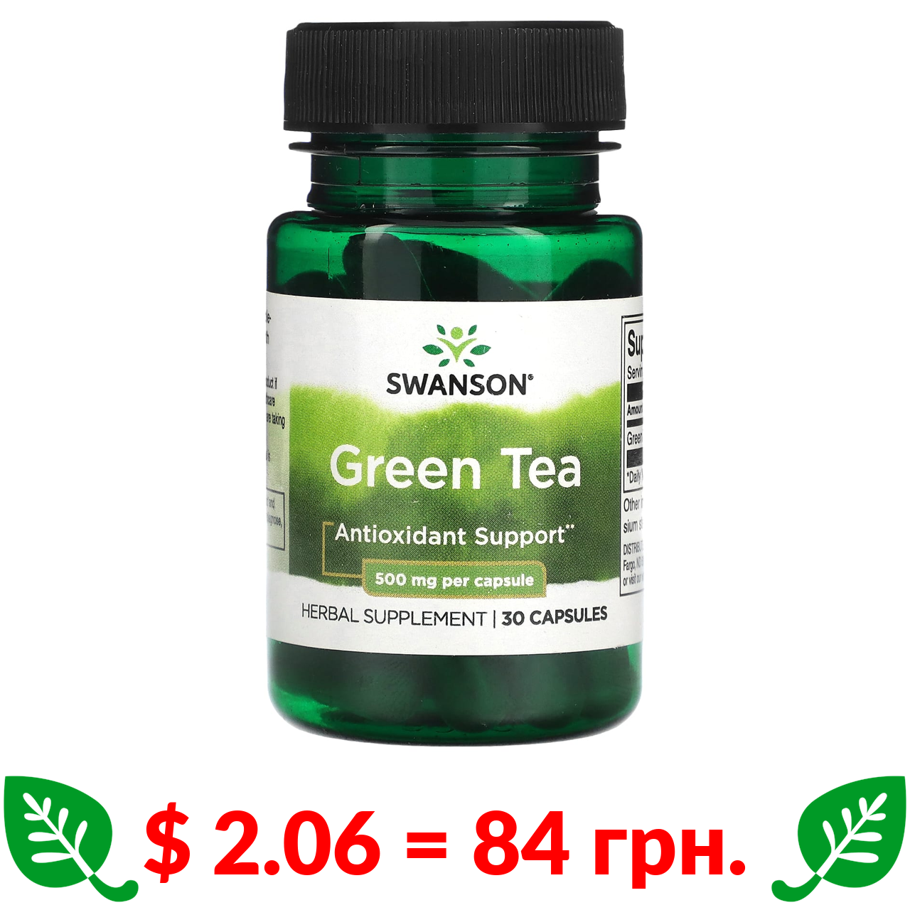 $ 2.06 = 84 грн. Swanson, зелений чай, 500 мг, 30 капсул