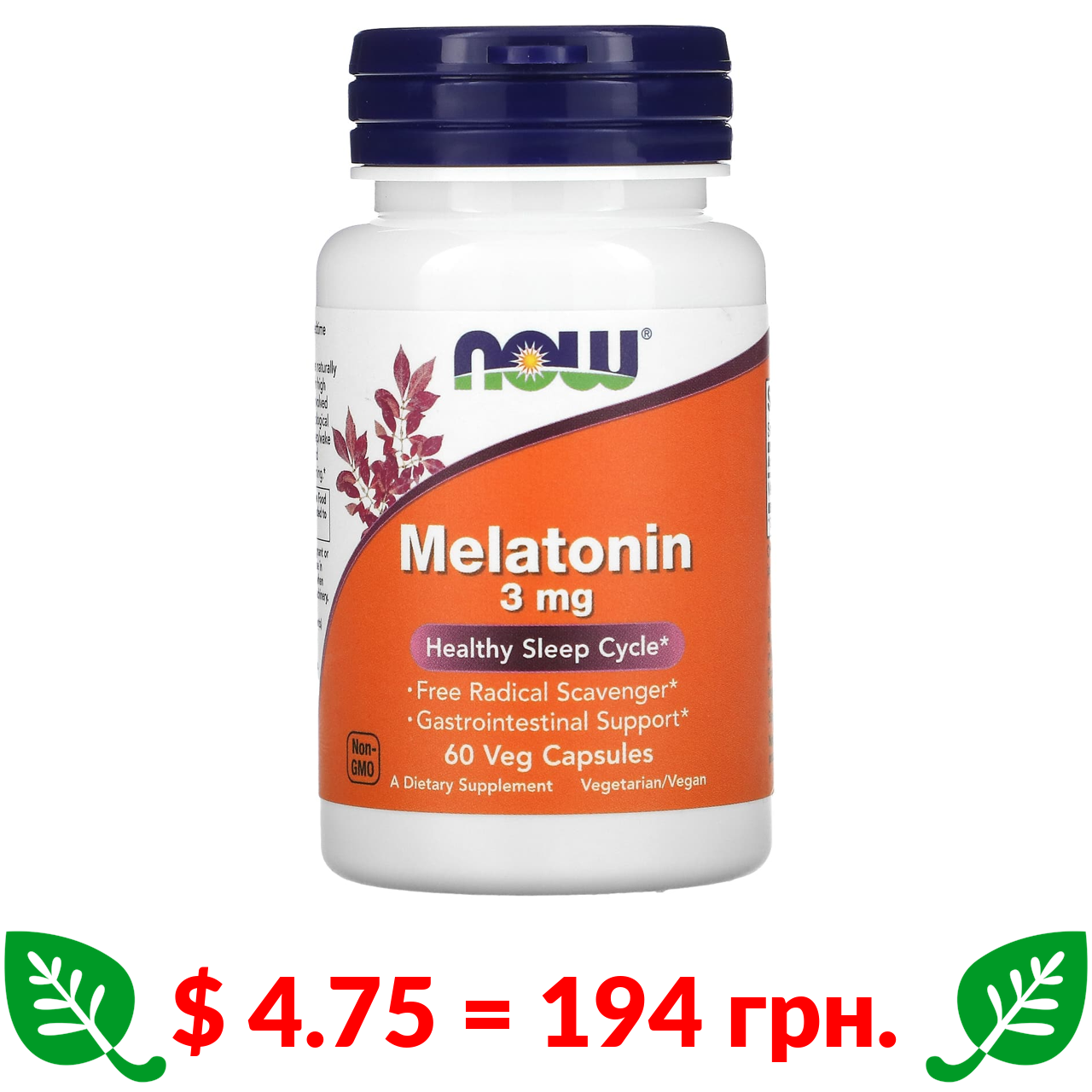 $ 4.75 = 194 грн. Now Foods, мелатонін, 3 мг, 60 вегетаріанських капсул