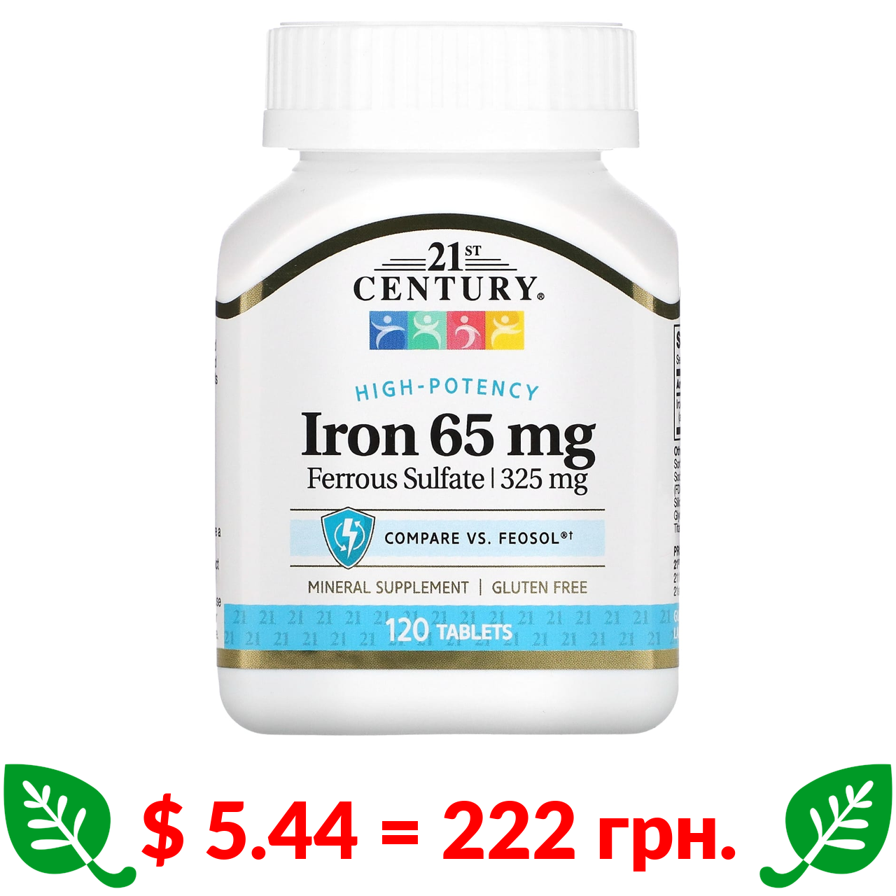 $ 5.44 = 222 грн. 21st Century, залізо, 65 мг, 120 таблеток