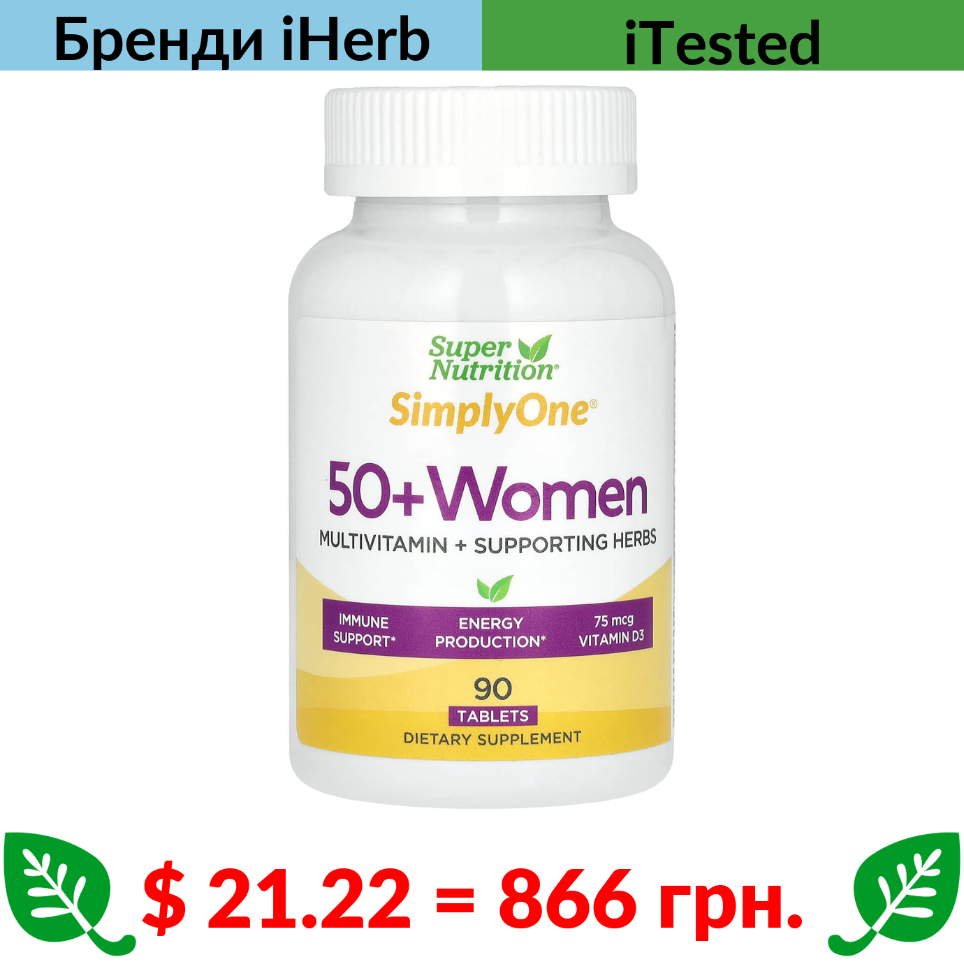 $ 21.22 = 866 грн. Super Nutrition, SimplyOne, мультивітаміни потрійної дії для жінок від 50 років, 90 таблеток