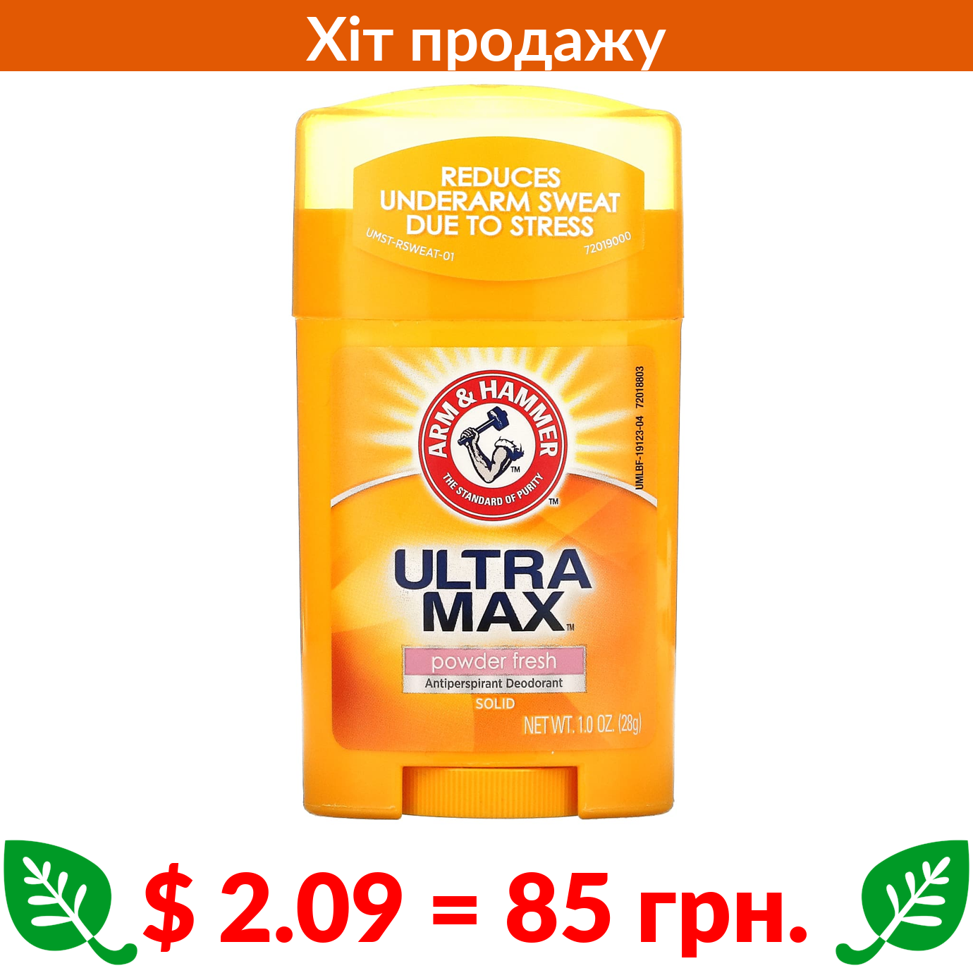 $ 2.09 = 85 грн. Arm & Hammer, UltraMax, твердий дезодорант-антиперспірант для чоловіків, зі свіжим ароматом, 28 г (1 унція)
