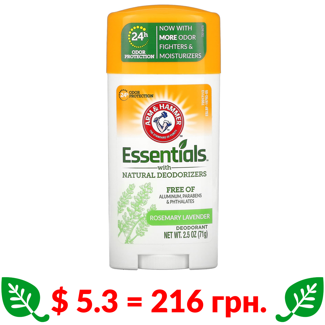 $ 5.3 = 216 грн. Arm & Hammer, Essentials, дезодорант із натуральними дезодорувальними речовинами, розмарин і лаванда, 71 г (2,5 унції)
