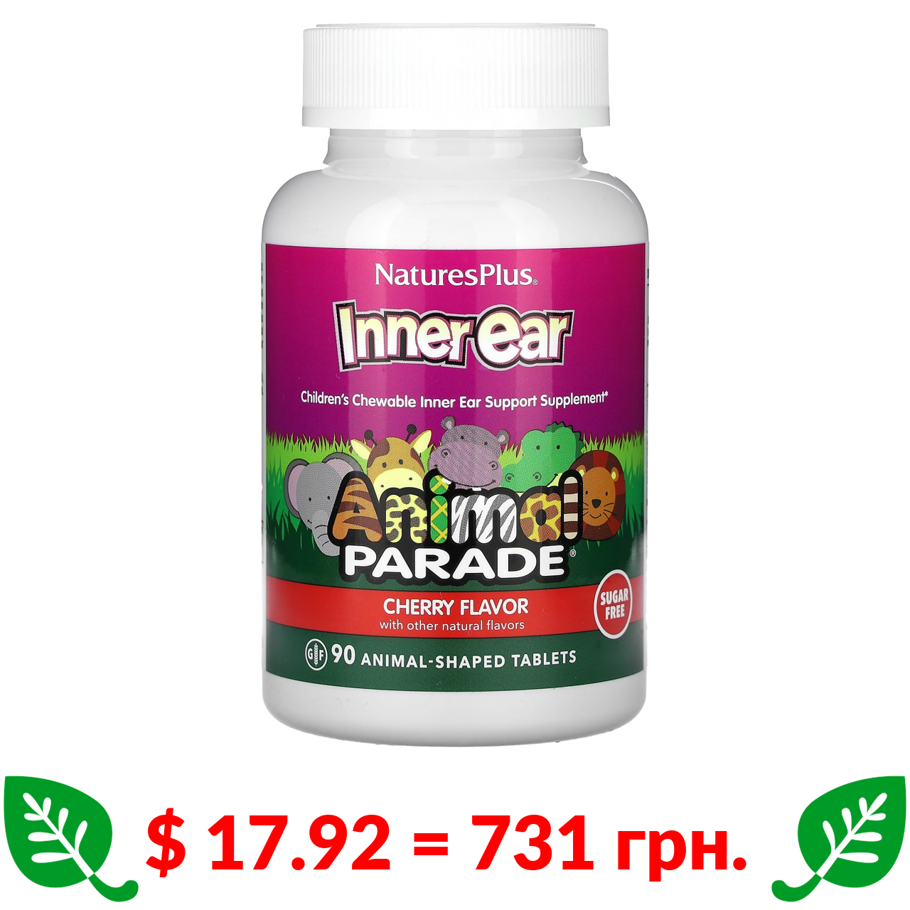 $ 17.92 = 731 грн. Nature’s Plus, Animal Parade, жувальні таблетки для дітей, для здоров’я внутрішнього вуха, вишня, 90 таблеток у формі тварин