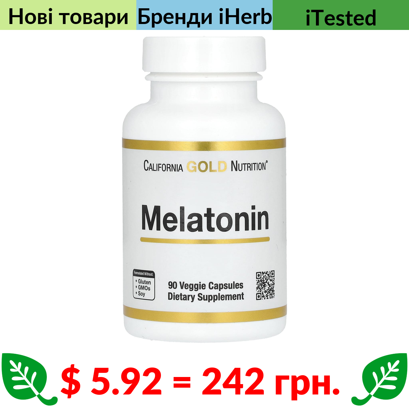$ 5.92 = 242 грн. ????️ у кошику ????️ California Gold Nutrition, мелатонін, 3 мг, 90 рослинних капсул