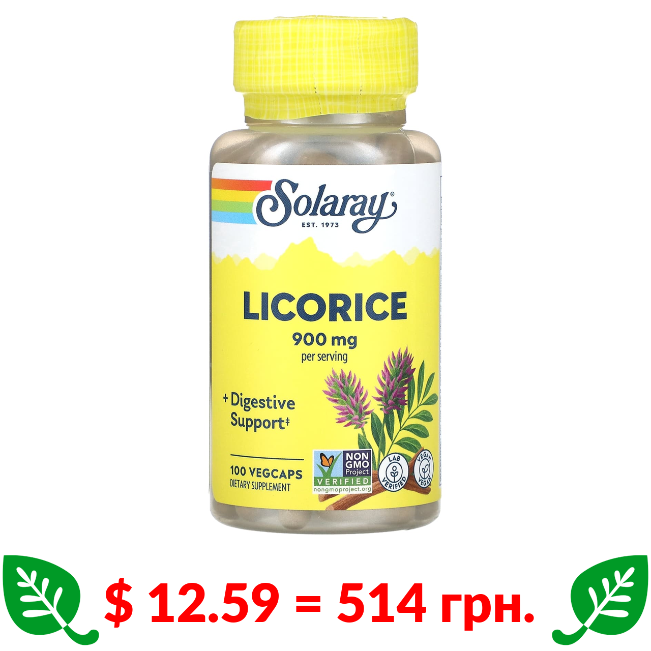 $ 12.59 = 514 грн. Solaray, солодка, 900 мг, 100 капсул VegCap (450 мг у капсулі)
