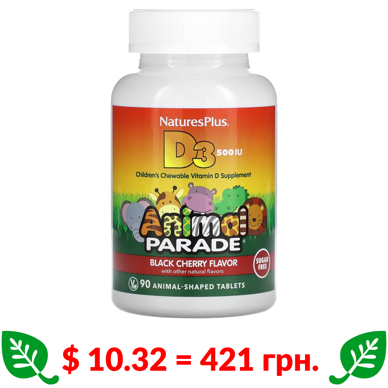 $ 10.32 = 421 грн. Nature’s Plus, Source of Life, Animal Parade, вітамін D3, з натуральним вишневим смаком, без цукру, 12,5 мг (500 МО), 90 таблеток у формі тварин