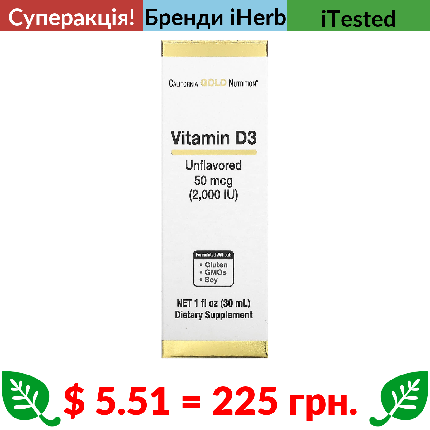 $ 5.51 = 225 грн. ???? cуперакція! ???? California Gold Nutrition, вітамін D3, без добавок, 2000 МО, 30 мл (1 рідк. унція)