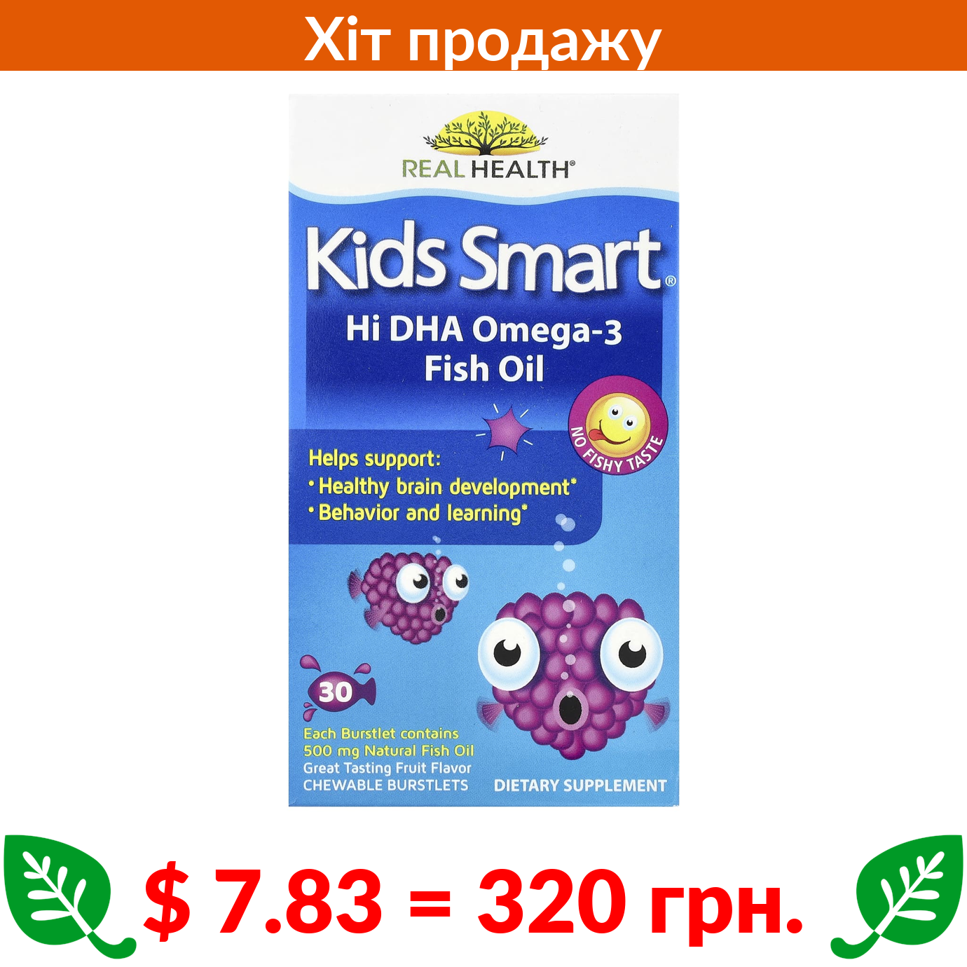 $ 7.83 = 320 грн. ????️ у кошику ????️ Bioglan, Kids Smart, риб’ячий жир із високим вмістом омега-3 ДГК, чудовий фруктовий смак, 30 жувальних капсул