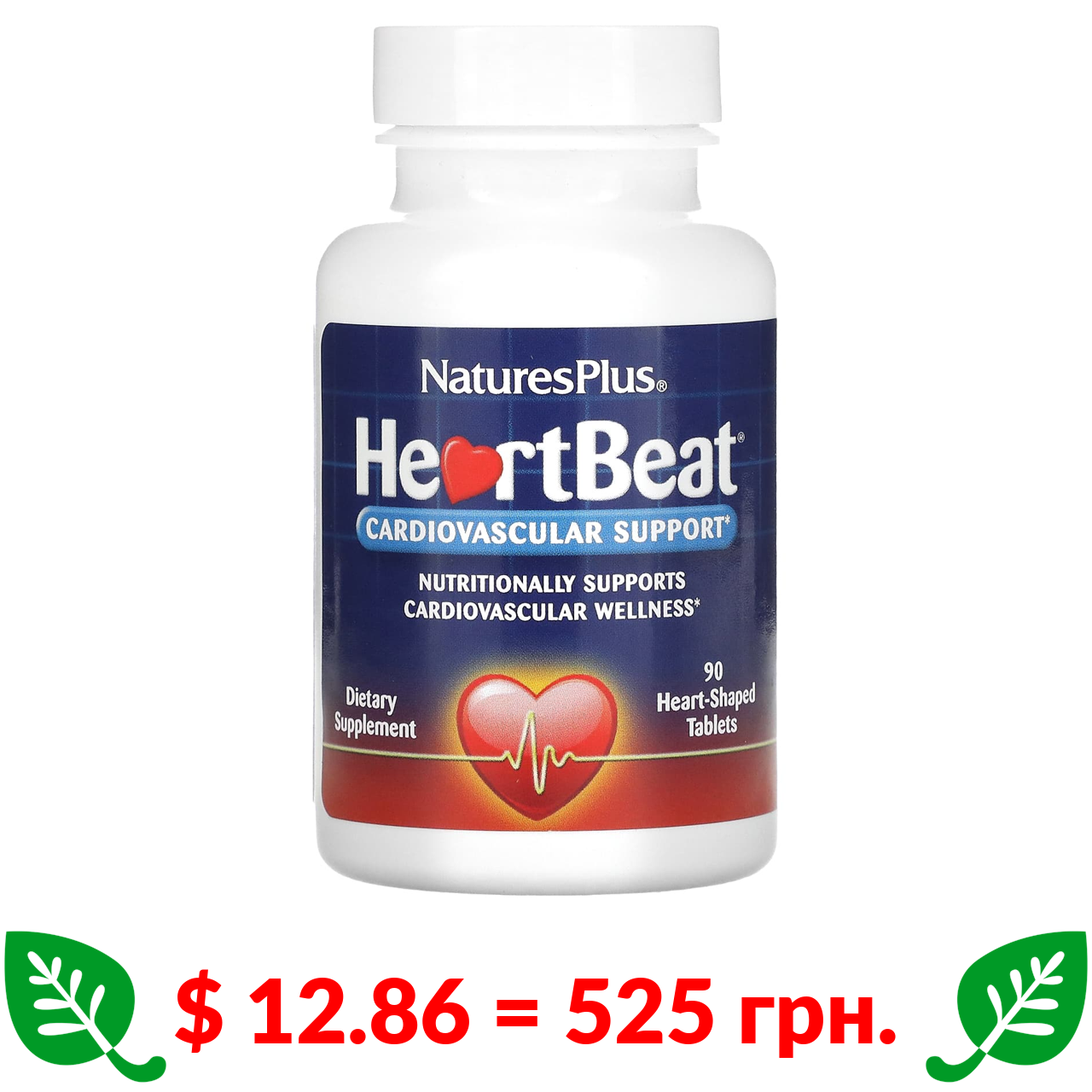 $ 12.86 = 525 грн. Nature’s Plus, HeartBeat, для підтримки серцево-судинної системи, 90 таблеток у формі серця