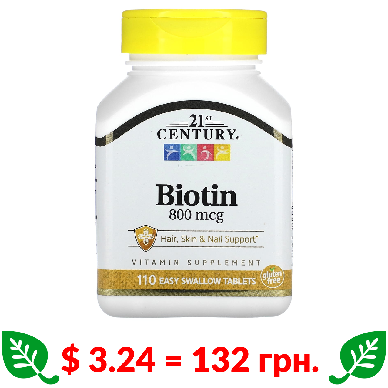 $ 3.24 = 132 грн. 21st Century, біотин, 800 мкг, 110 таблеток, які легко ковтати