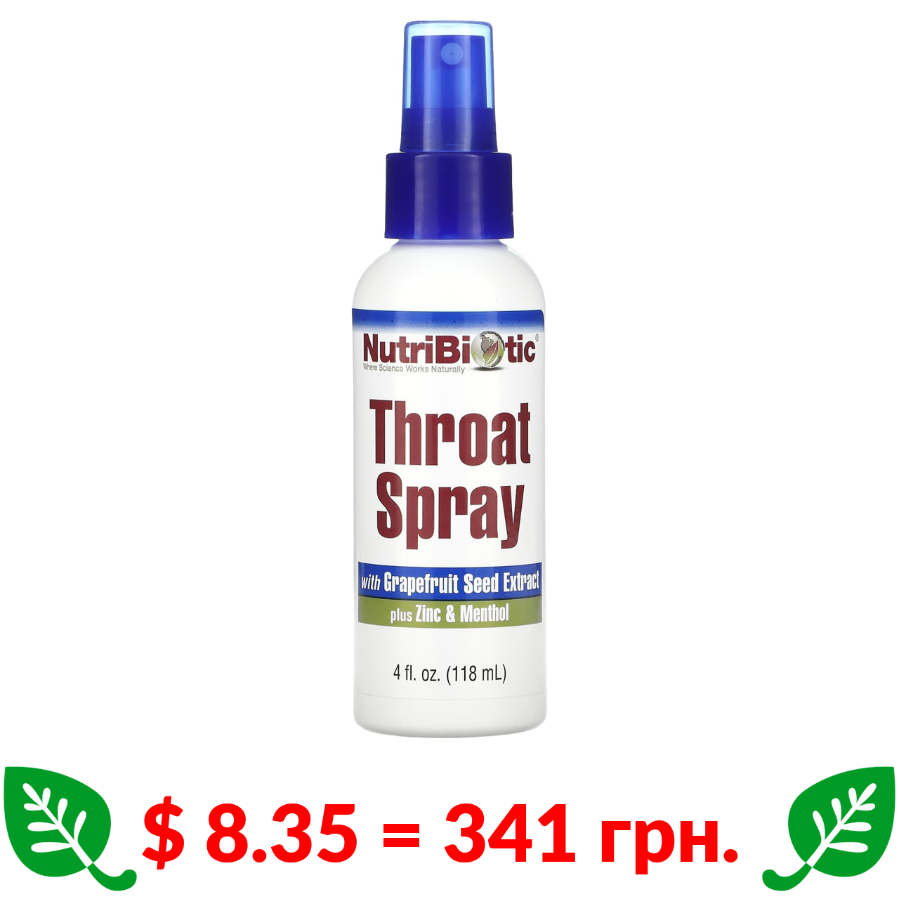 $ 8.35 = 341 грн. NutriBiotic, Спрей для горла з екстрактом насіння грейпфрута, цинком і ментолом, 118 мл (4 рідк. унції)
