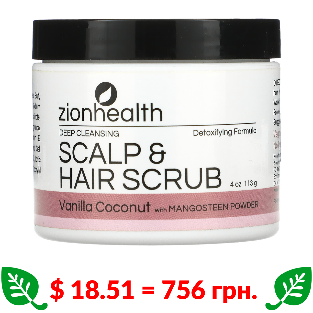 $ 18.51 = 756 грн. Zion Health, скраб для глибокого очищення шкіри голови та волосся, ваніль і кокос, 113 г (4 унції)