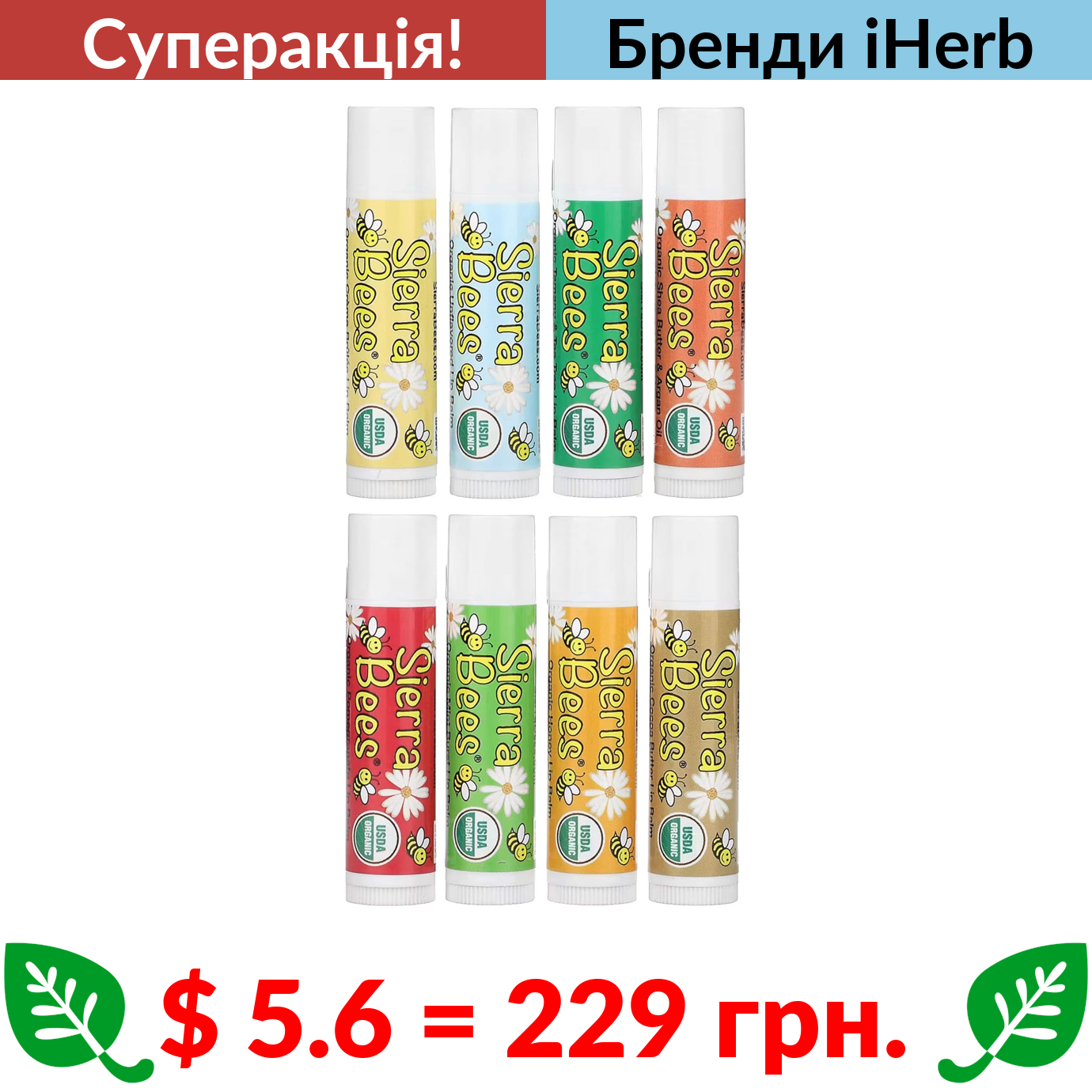 $ 5.6 = 229 грн. ???? cуперакція! ???? Sierra Bees, набір органічних бальзамів для губ, 8 шт,. по 4,25 г (0,15 унції)