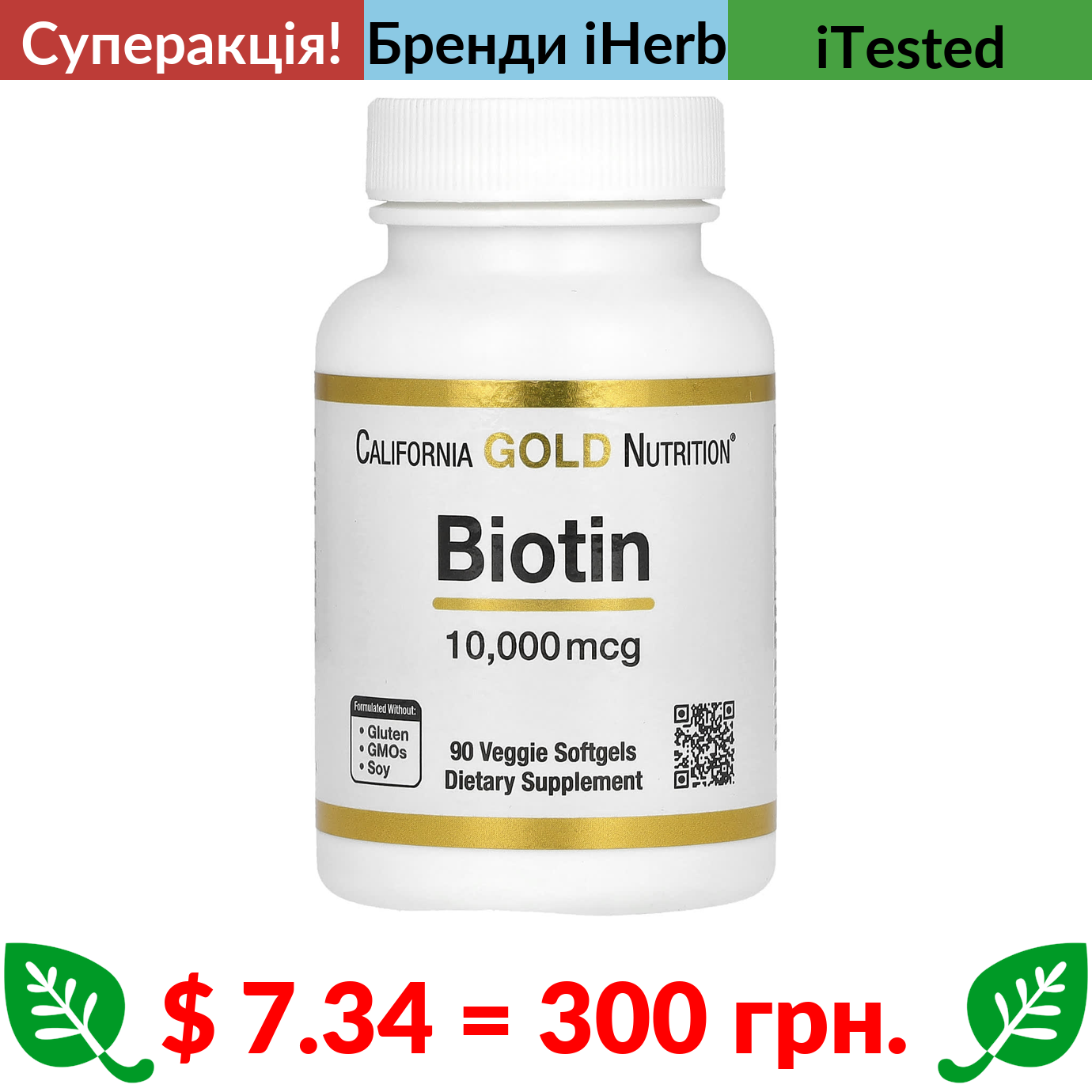 $ 7.34 = 300 грн. ???? cуперакція! ???? California Gold Nutrition, біотин, 10000 мкг, 90 вегетаріанських капсул