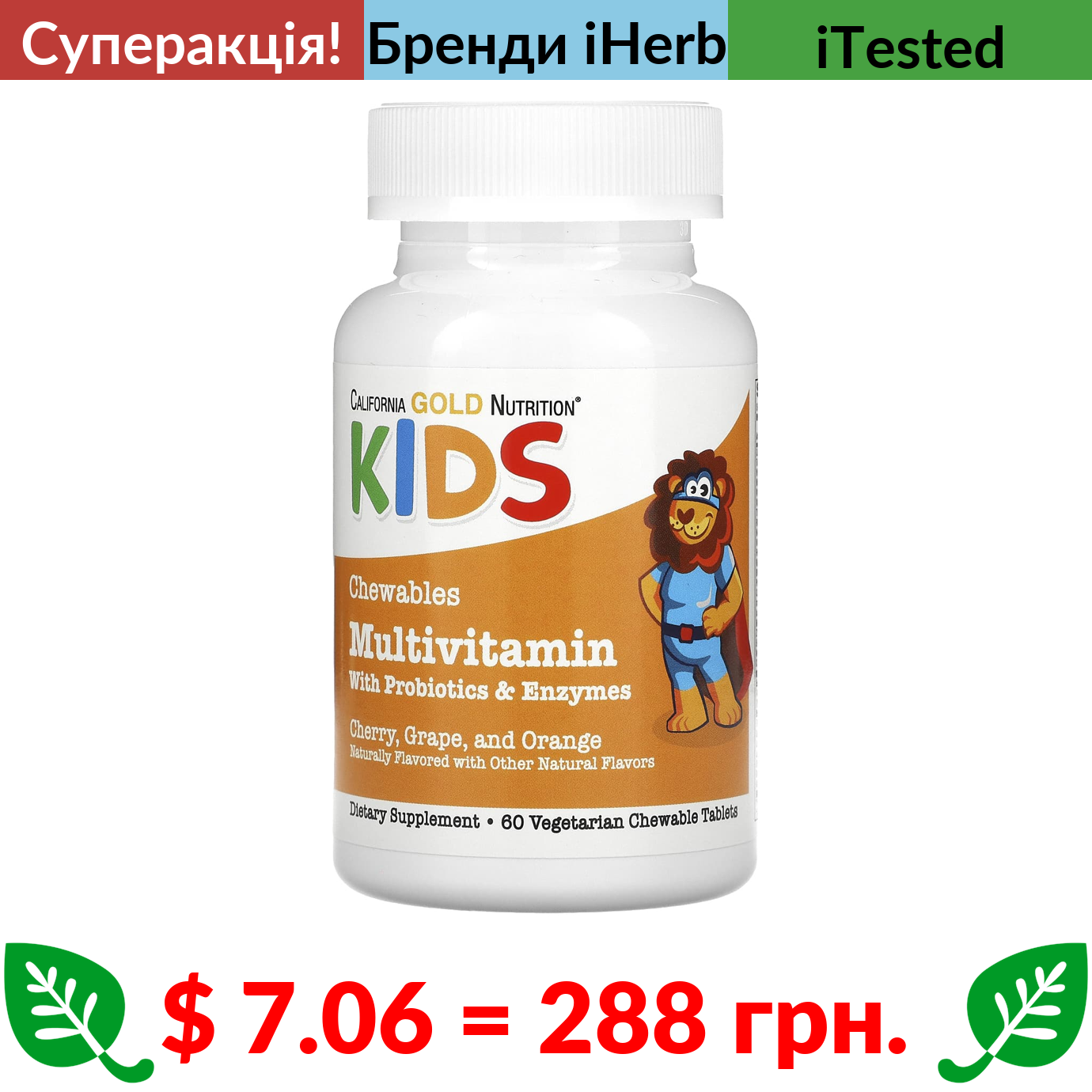 $ 7.06 = 288 грн. ???? cуперакція! ???? California Gold Nutrition, жувальні мультивітаміни з пробіотиками та ферментами для дітей, фруктове асорті, 60 вегетаріанських таблеток