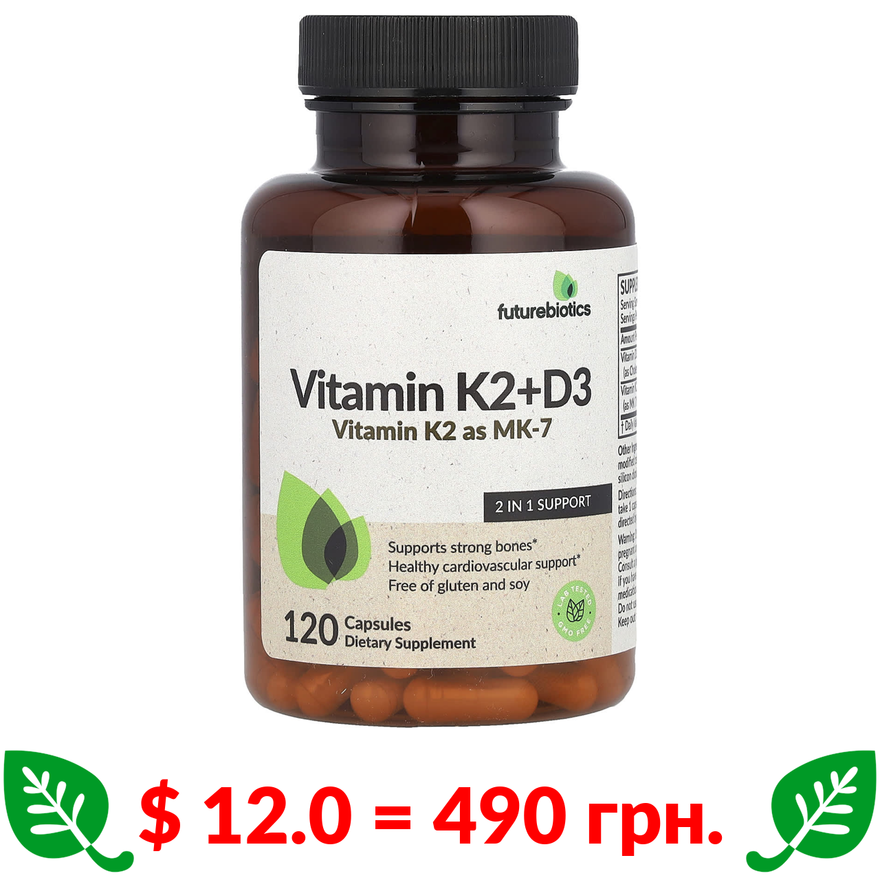 $ 12.0 = 490 грн. ????️ у кошику ????️ Futurebiotics, Вітамін K2 + D3 з вітаміном K2 у формі МК-7, 120 капсул