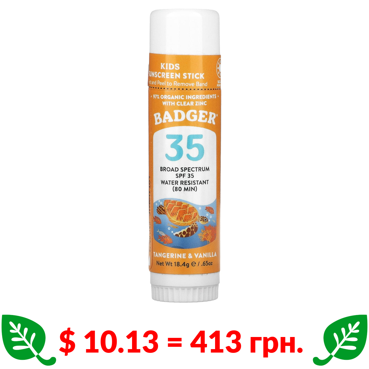 $ 10.13 = 413 грн. Badger Company, Kids, Natural Mineral Sunscreen Face Stick, SPF 35, Tangerine & Vanilla, 0.65 oz (18.4 g)