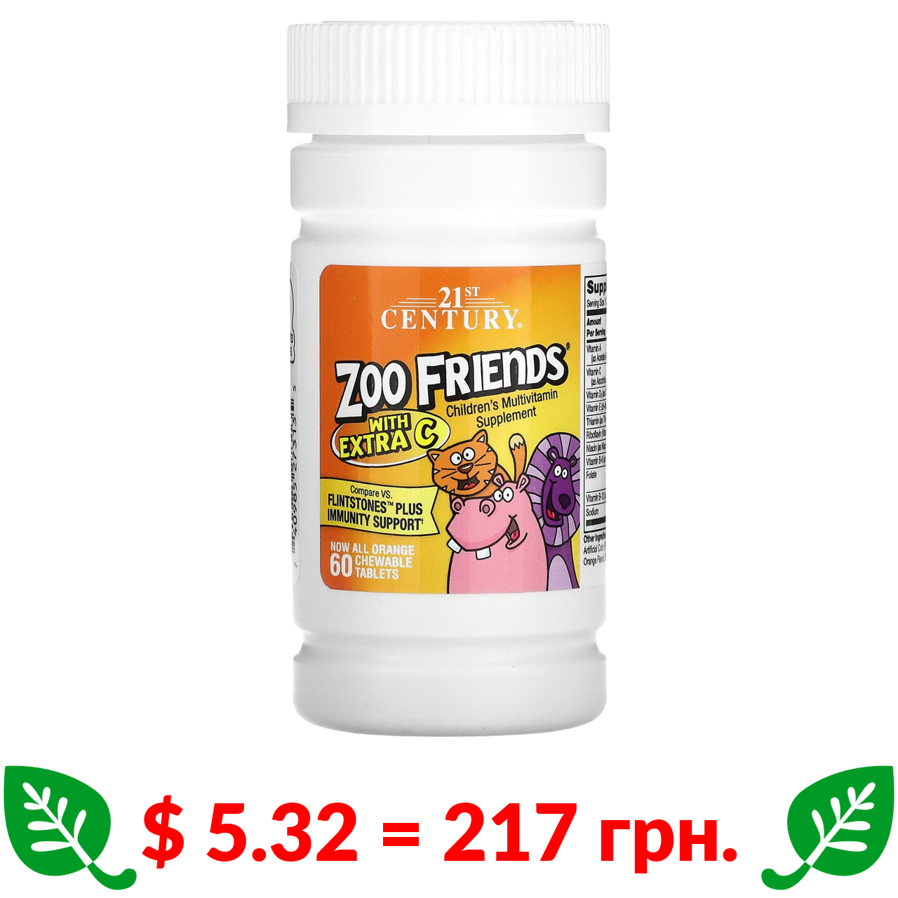 $ 5.32 = 217 грн. 21st Century, Zoo Friends з додаванням вітаміну C, апельсин, 60 жувальних таблеток