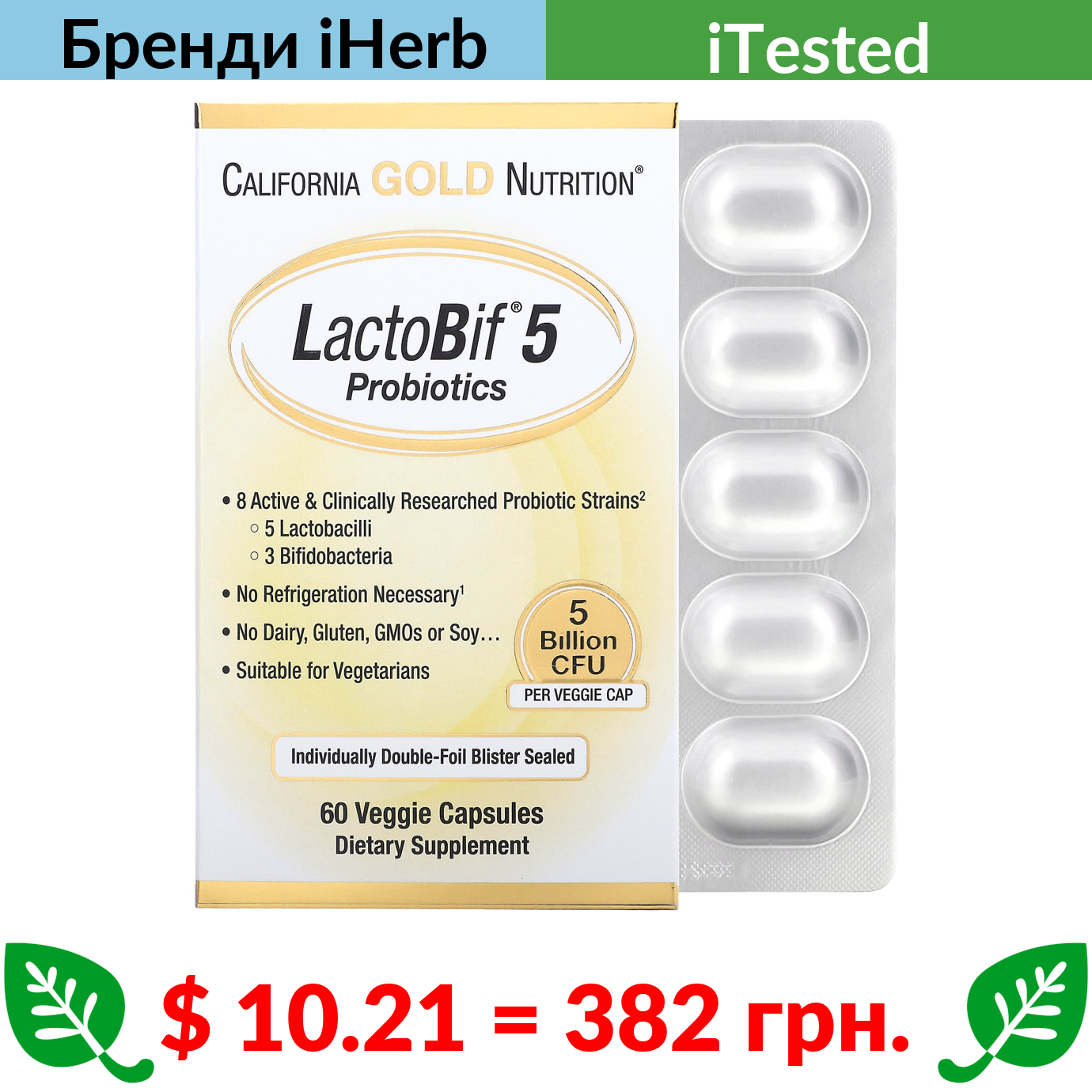 $ 10.21 = 382 грн. California Gold Nutrition, LactoBif, пробіотики, 5 млрд КУО, 60 вегетаріанських капсул
