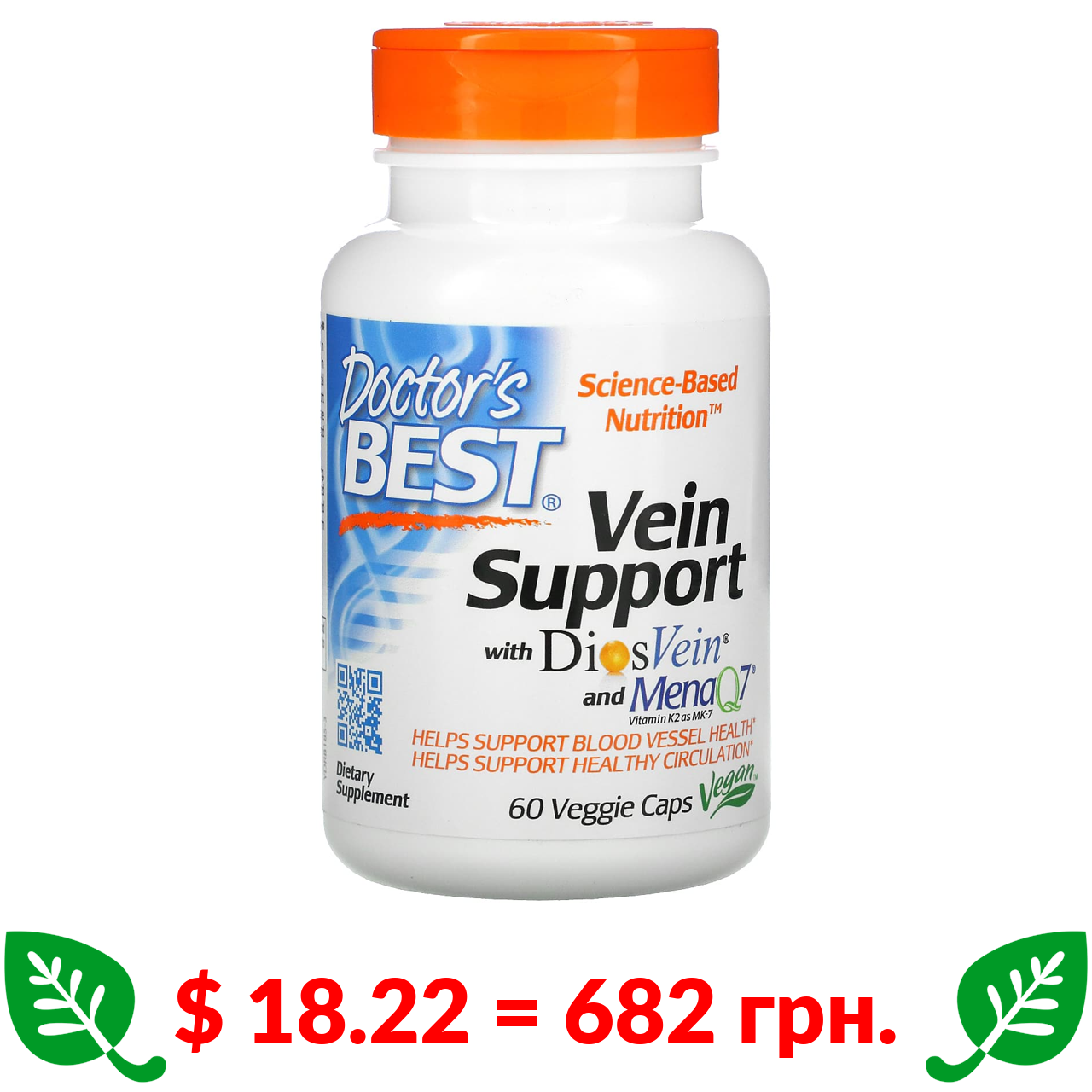 $ 18.22 = 682 грн. Doctor’s Best, підтримка для вен з DiosVein і MenaQ7, 60 вегетаріанських капсул