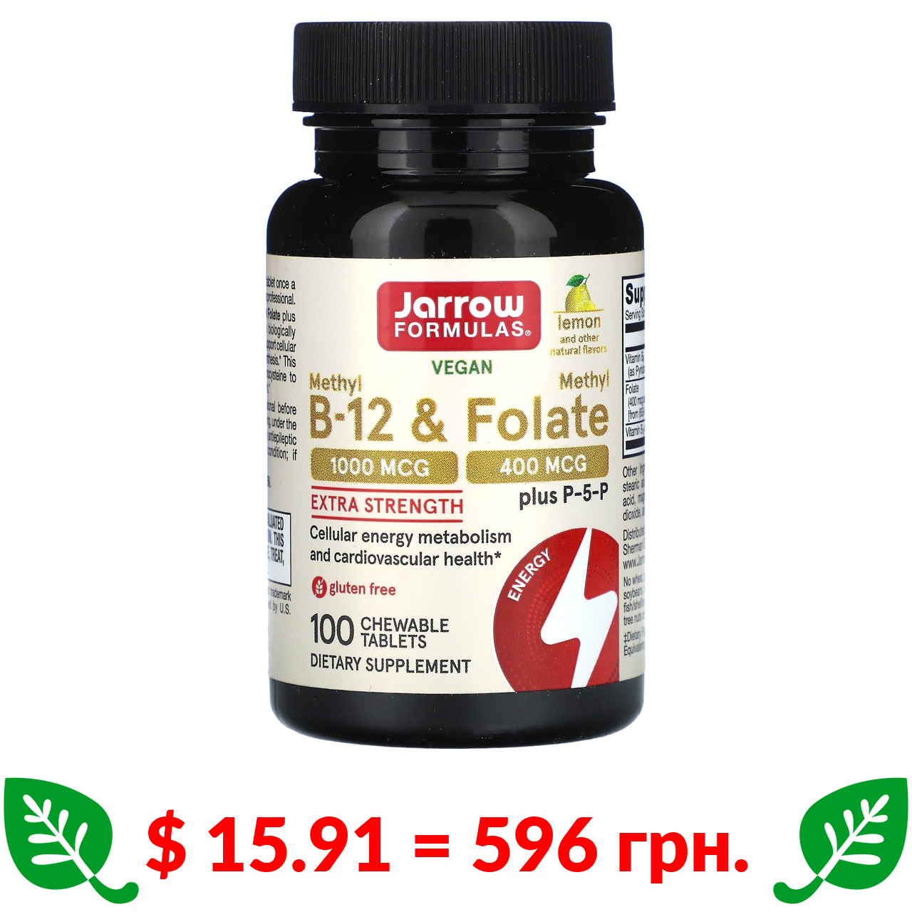 $ 15.91 = 596 грн. Jarrow Formulas, метил В12 і метилфолат, лимон, 100 жувальних таблеток