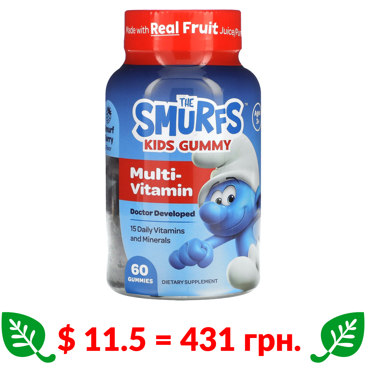 $ 11.5 = 431 грн. The Smurfs, жувальні мультивітаміни для дітей від 3 років, зі смаком ягід, 60 жувальних мармеладок