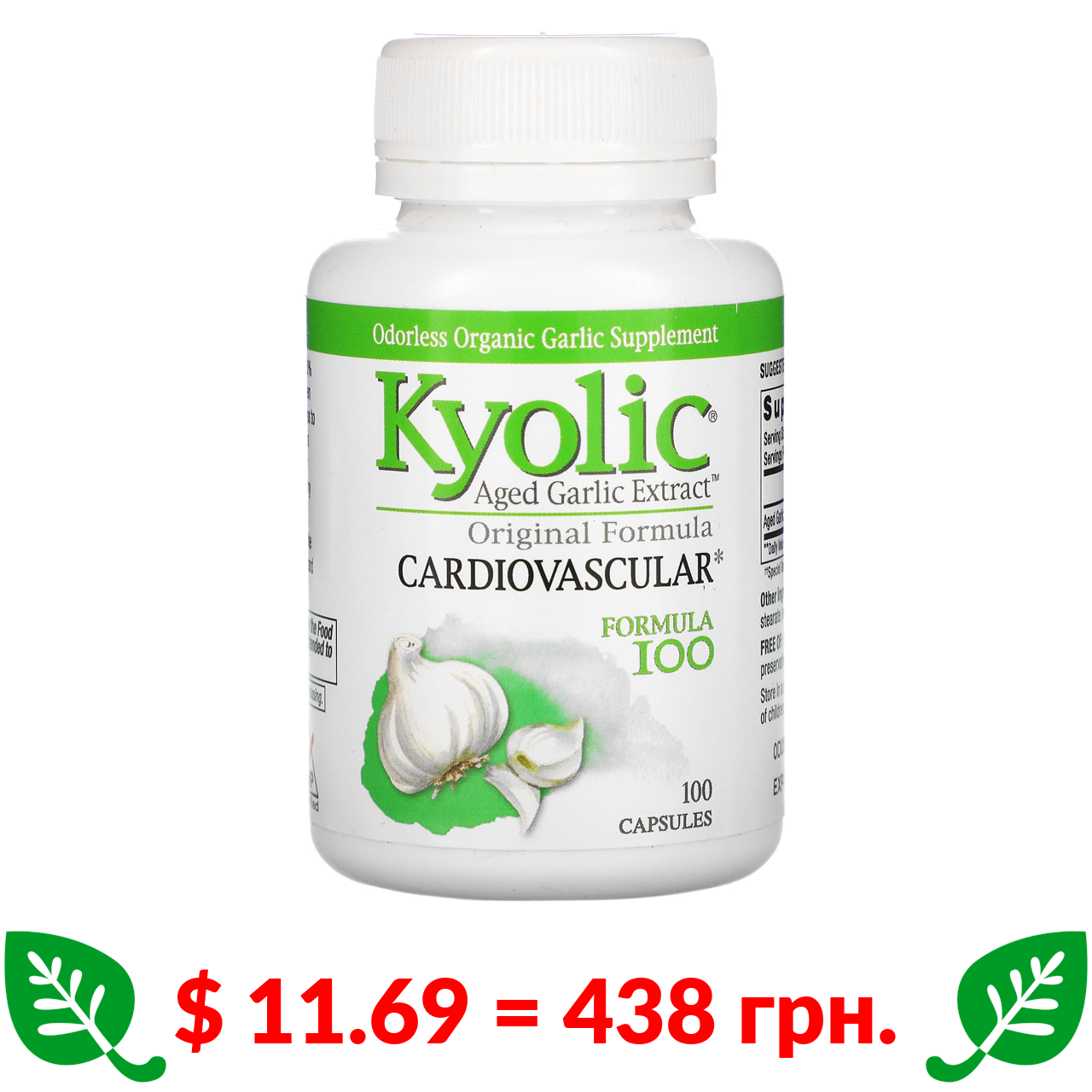 $ 11.69 = 438 грн. Kyolic, Aged Garlic Extract, витриманий екстракт часнику, для серцево-судинної системи, оригінальна формула, 100 капсул
