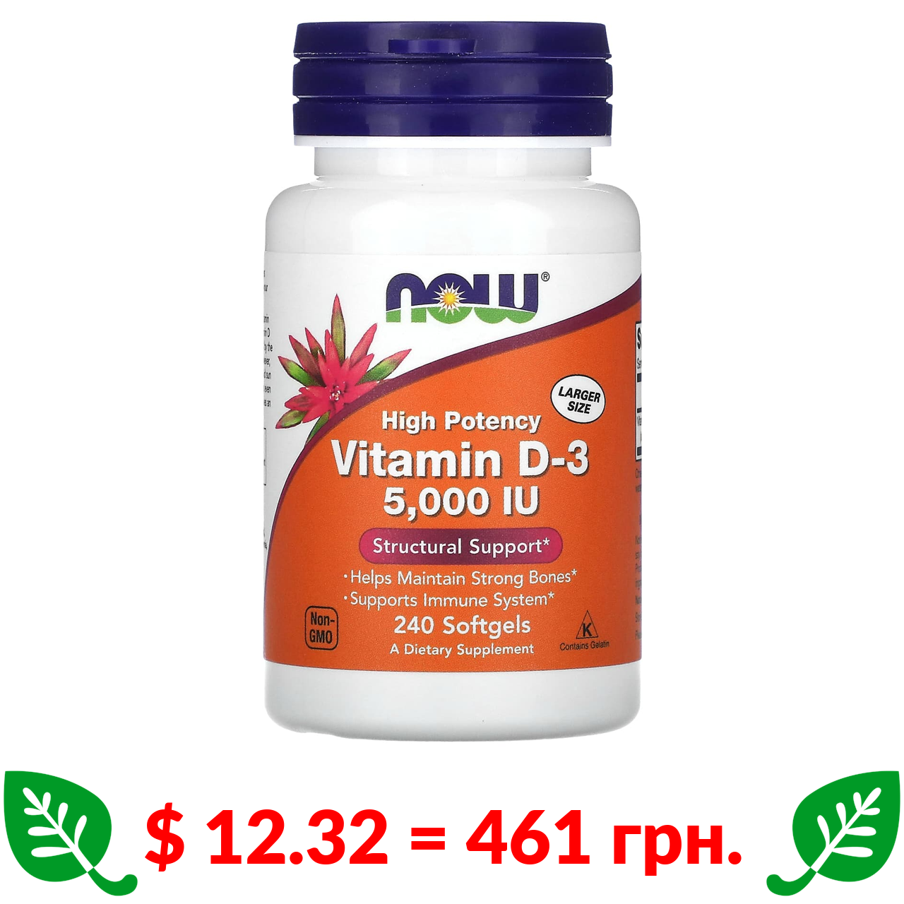 $ 12.32 = 461 грн. Now Foods, високоефективний вітамін D3, 125 мкг (5000 МО), 240 капсул