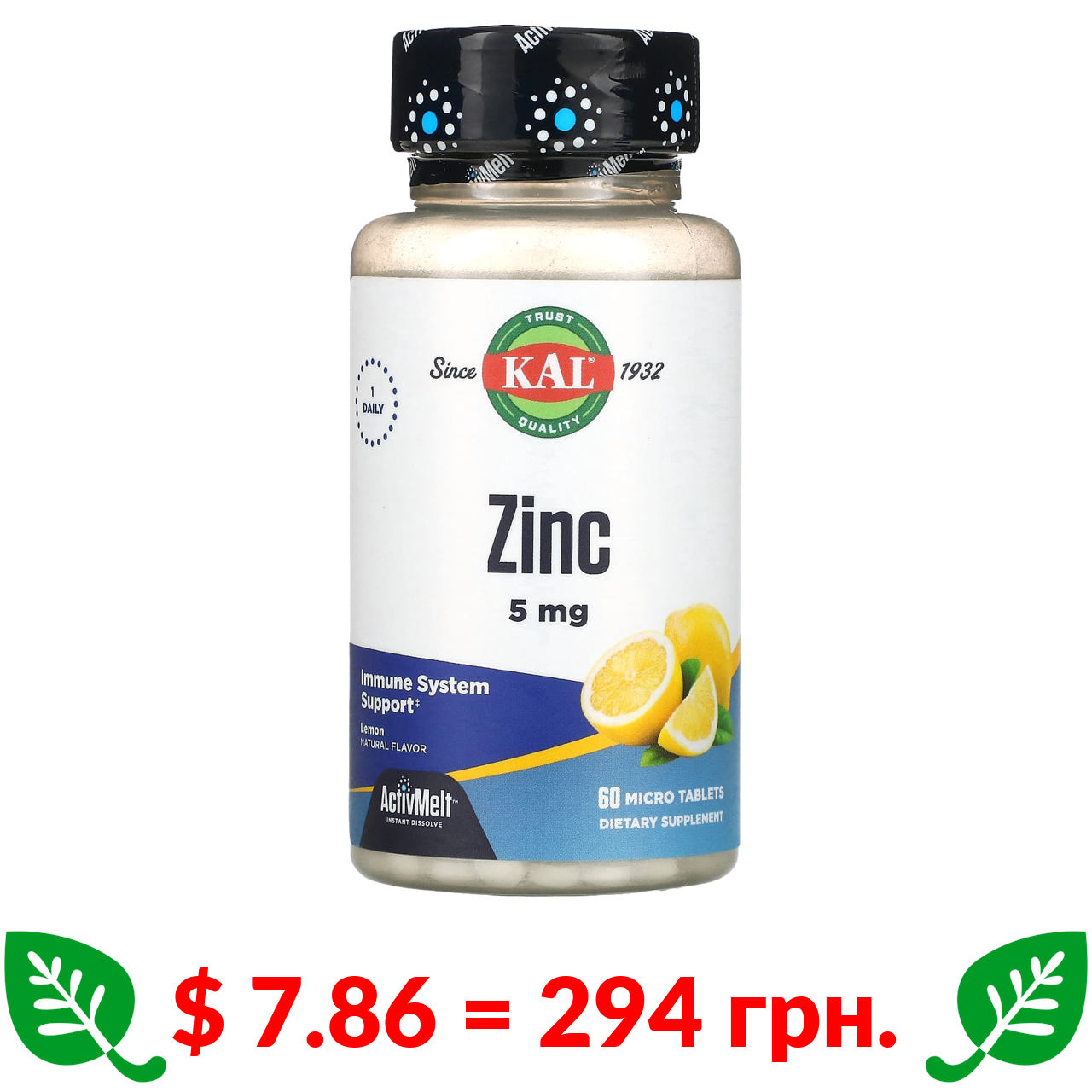 $ 7.86 = 294 грн. KAL, цинк, солодкий лимон, 5 мг, 60 мікротаблеток