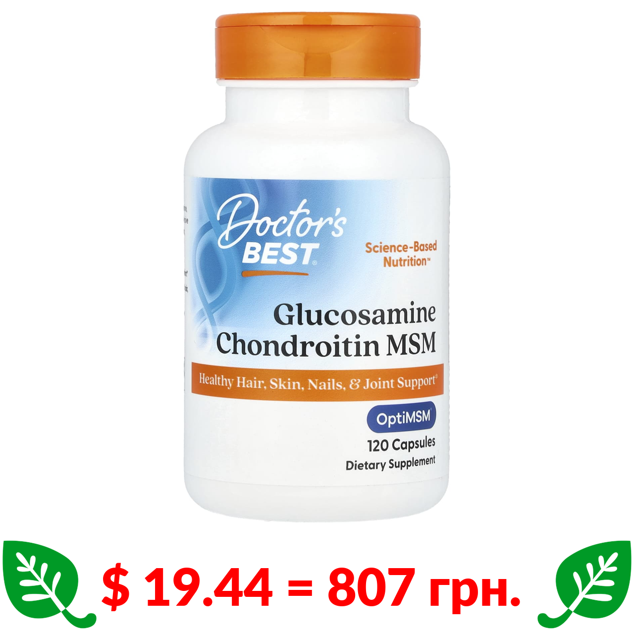 $ 19.44 = 807 грн. Doctor’s Best, глюкозамін, хондроїтин та МСМ з OptiMSM, 120 рослинних капсул