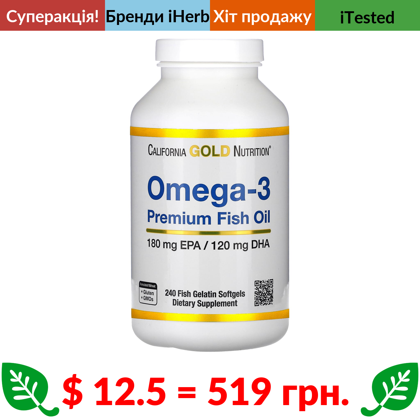 $ 12.5 = 519 грн. ???? cуперакція! ???? California Gold Nutrition, омега-3, риб’ячий жир преміальної якості, 240 риб’ячих желатинових капсул