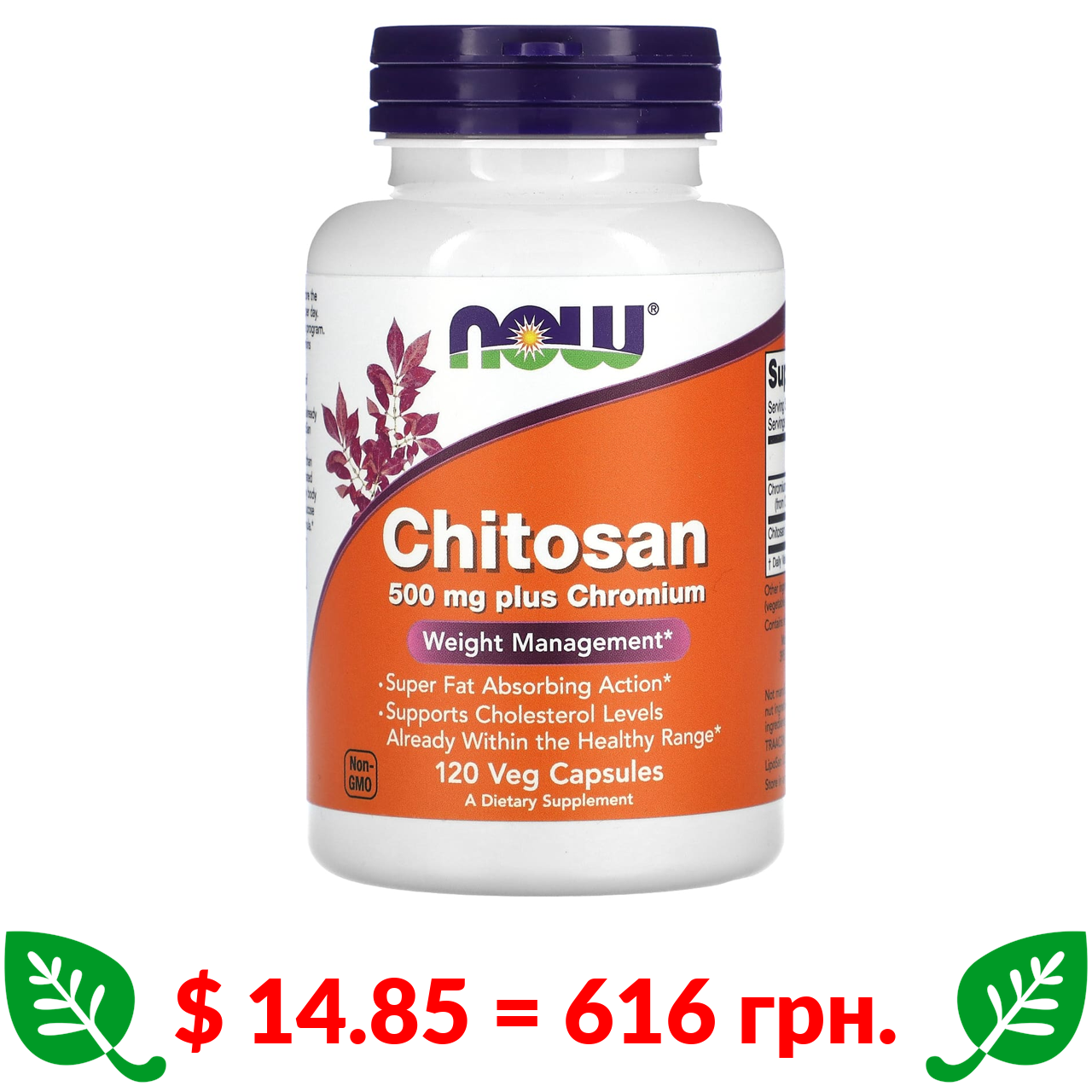 $ 14.85 = 616 грн. Now Foods, хітозан з хромом, 500 мг, 120 вегетаріанських капсул