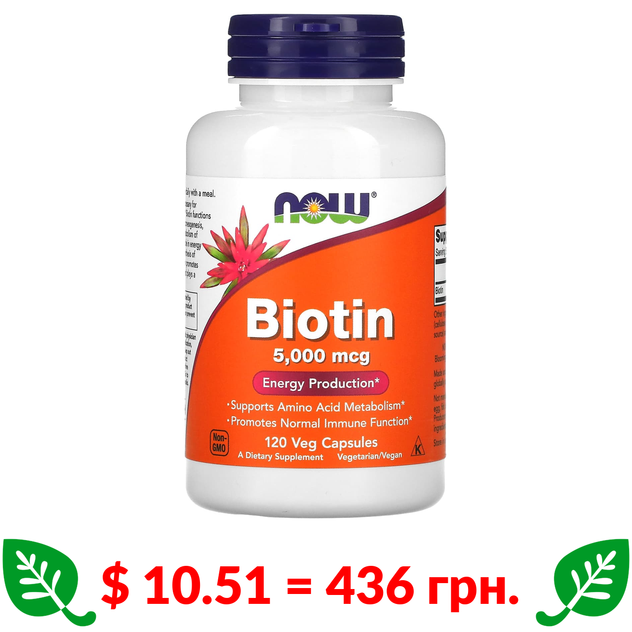 $ 10.51 = 436 грн. Now Foods, біотин, 5000 мкг, 120 вегетаріанських капсул